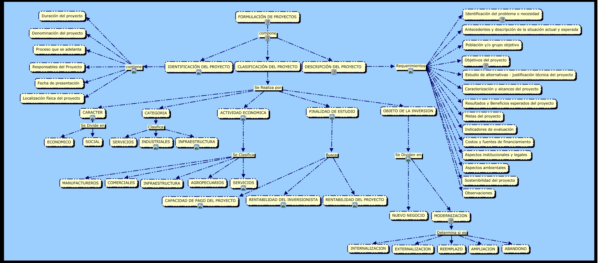 Este Cmap, tiene información relacionada con: Formulacion y Evalucion de Proyectos.cmap, CLASIFICACIÓN DEL PROYECTO Se Realiza por CARACTER, CLASIFICACIÓN DEL PROYECTO Se Realiza por OBJETO DE LA INVERSION, FINALIDAD DE ESTUDIO Busca RENTABILIDAD DEL PROYECTO, CATEGORIA Clasifica INFRAESTRUCTURA, ACTIVIDAD ECONOMICA Se Clasifica SERVICIOS, DESCRIPCIÓN DEL PROYECTO Requerimientos Costos y fuentes de financiamiento, ACTIVIDAD ECONOMICA Se Clasifica MANUFACTUREROS, CLASIFICACIÓN DEL PROYECTO Se Realiza por ACTIVIDAD ECONOMICA, OBJETO DE LA INVERSION Se Dividen en MODERNIZACION, CATEGORIA Clasifica SERVICIOS, ACTIVIDAD ECONOMICA Se Clasifica AGROPECUARIOS, FORMULACIÓN DE PROYECTOS compone CLASIFICACIÓN DEL PROYECTO, DESCRIPCIÓN DEL PROYECTO Requerimientos Resultados y Beneficios esperados del proyecto, IDENTIFICACIÓN DEL PROYECTO contiene Duración del proyecto, CARACTER Se Divide en ECONOMICO, MODERNIZACION Determina si es EXTERNALIZACION, MODERNIZACION Determina si es INTERNALIZACION, CATEGORIA Clasifica INDUSTRIALES, ACTIVIDAD ECONOMICA Se Clasifica INFRAESTRUCTURA, IDENTIFICACIÓN DEL PROYECTO contiene Localización física del proyecto