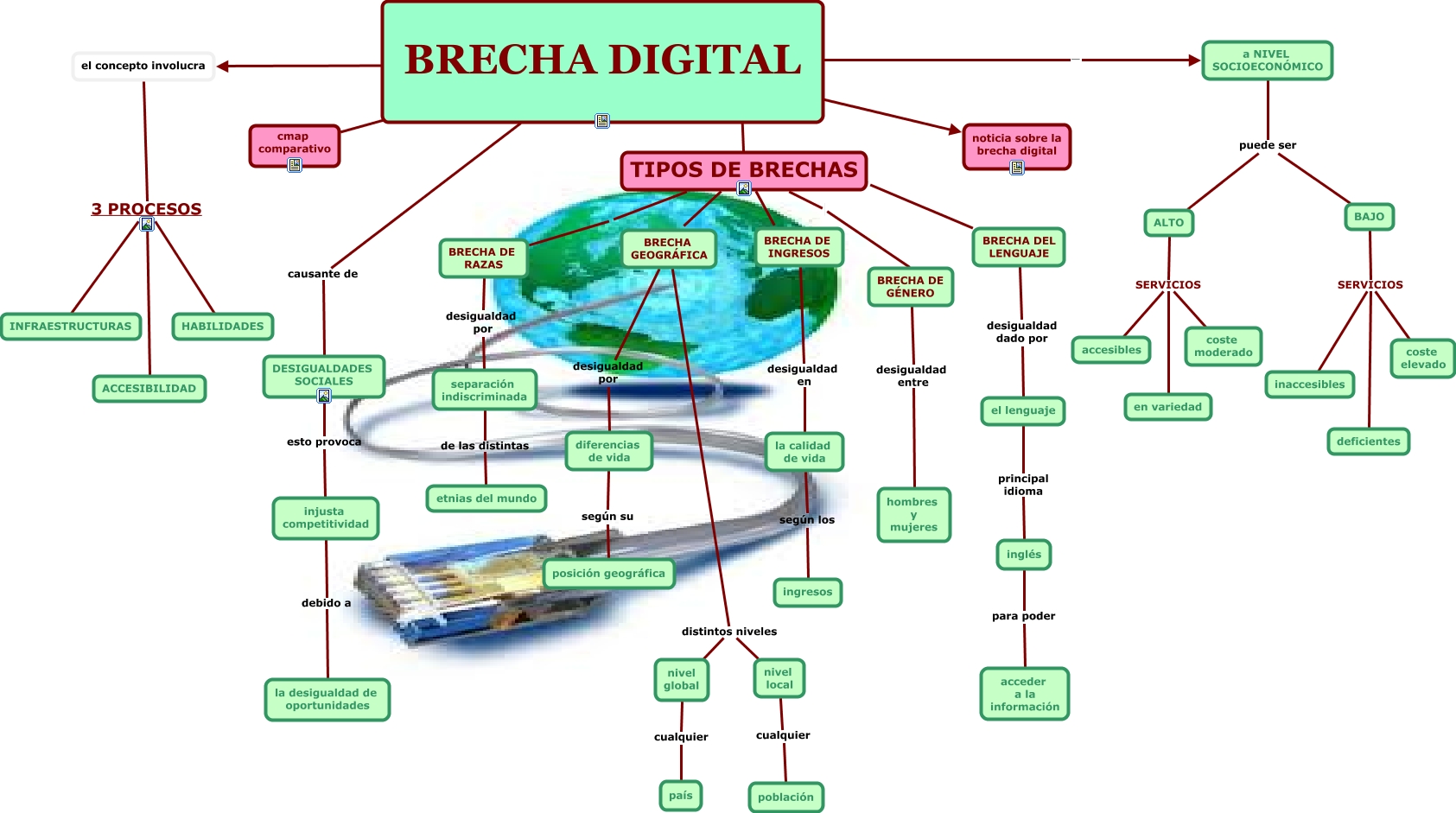 Este Cmap, tiene información relacionada con: CMAP LA BRECHA DIGITAL- maría bocanegra, el concepto involucra 3 PROCESOS ACCESIBILIDAD, nivel local cualquier población, a NIVEL SOCIOECONÓMICO puede ser BAJO, ALTO SERVICIOS coste moderado, BRECHA DIGITAL ???? TIPOS DE BRECHAS, BRECHA GEOGRÁFICA distintos niveles nivel global, injusta competitividad debido a la desigualdad de oportunidades, BRECHA DIGITAL causante de DESIGUALDADES SOCIALES, BAJO SERVICIOS inaccesibles, el lenguaje principal idioma inglés, TIPOS DE BRECHAS - BRECHA DEL LENGUAJE, a NIVEL SOCIOECONÓMICO puede ser ALTO, el concepto involucra 3 PROCESOS INFRAESTRUCTURAS, TIPOS DE BRECHAS BRECHA GEOGRÁFICA, inglés para poder acceder a la información, el concepto involucra 3 PROCESOS HABILIDADES, BAJO SERVICIOS coste elevado, nivel global cualquier país, ALTO SERVICIOS accesibles, DESIGUALDADES SOCIALES esto provoca injusta competitividad