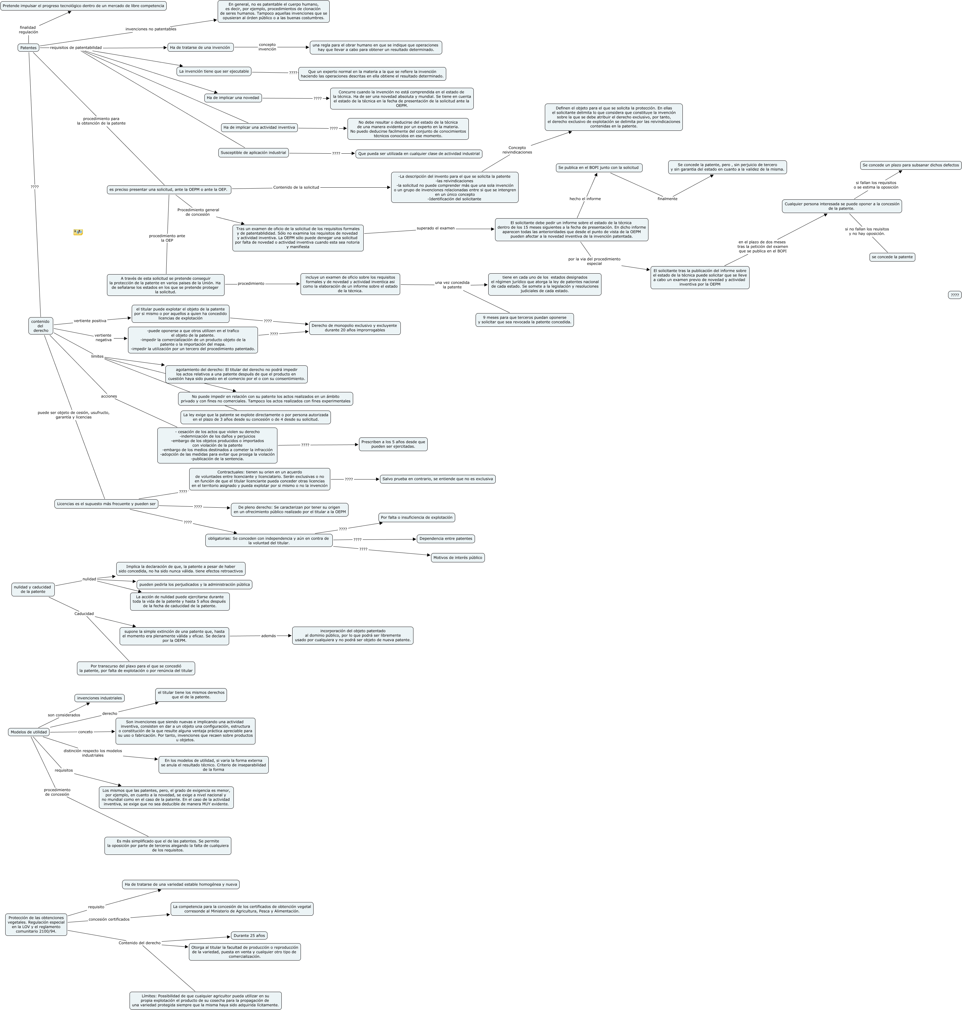 Este Cmap, tiene información relacionada con: patentes1, Modelos de utilidad requisitos Los mismos que las patentes, pero, el grado de exigencia es menor, por ejemplo, en cuanto a la novedad, se exige a nivel nacional y no mundial como en el caso de la patente. En el caso de la actividad inventiva, se exige que no sea deducible de manera MUY evidente., el titular puede explotar el objeto de la patente por si mismo o por aquellos a quien ha concedido licencias de explotación ???? Derecho de monopolio exclusivo y excluyente durante 20 años improrrogables, Patentes requisitos de patentabilidad Ha de tratarse de una invención, Tras un examen de oficio de la solicitud de los requisitos formales y de patentablididad. Sólo no examina los requisitos de novedad y actividad inventiva. La OEPM sólo puede denegar una solicitud por falta de novedad o actividad inventiva cuando esta sea notoria y manifiesta superado el examen El solicitante debe pedir un informe sobre el estado de la técnica dentro de los 15 meses siguientes a la fecha de presentación. En dicho informe aparecen todas las anterioridades que desde el punto de vista de la OEPM pueden afectar a la novedad inventiva de la invención patentada., A través de esta solicitud se pretende conseguir la protección de la patente en varios paises de la Unión. Ha de señalarse los estados en los que se pretende proteger la solicitud. procedimiento incluye un examen de oficio sobre los requisitos formales y de novedad y actividad inventica asi como la elaboración de un informe sobre el estado de la técnica., es preciso presentar una solicitud, ante la OEPM o ante la OEP. Procedimiento general de concesión Tras un examen de oficio de la solicitud de los requisitos formales y de patentablididad. Sólo no examina los requisitos de novedad y actividad inventiva. La OEPM sólo puede denegar una solicitud por falta de novedad o actividad inventiva cuando esta sea notoria y manifiesta, contenido del derecho límites La ley exige que la patente se explote directamente o por persona autorizada en el plazo de 3 años desde su concesión o de 4 desde su solicitud., contenido del derecho acciones - cesación de los actos que violen su derecho -indemnización de los daños y perjuicios -embargo de los objetos producidos o importados con violación de la patente -embargo de los medios destinados a cometer la infracción -adopción de las medidas para evitar que prosiga la violación -publicación de la sentencia., nulidad y caducidad de la patente nulidad La acción de nulidad puede ejercitarse durante toda la vida de la patente y hasta 5 años después de la fecha de caducidad de la patente., obligatorias: Se conceden con independencia y aún en contra de la voluntad del titular. ???? Motivos de interés público, Patentes requisitos de patentabilidad Ha de implicar una novedad, El solicitante debe pedir un informe sobre el estado de la técnica dentro de los 15 meses siguientes a la fecha de presentación. En dicho informe aparecen todas las anterioridades que desde el punto de vista de la OEPM pueden afectar a la novedad inventiva de la invención patentada. por la via del procedimiento especial El solicitante tras la publicación del informe sobre el estado de la técnica puede solicitar que se lleve a cabo un examen previo de novedad y actividad inventiva por la OEPM, Protección de las obtenciones vegetales. Regulación especial en la LOV y el reglamento comunitario 2100/94. requisito Ha de tratarse de una variedad estable homogénea y nueva, La invención tiene que ser ejecutable ???? Que un experto normal en la materia a la que se refiere la invención haciendo las operaciones descritas en ella obtiene el resultado determinado., es preciso presentar una solicitud, ante la OEPM o ante la OEP. Contenido de la solicitud -La descripción del invento para el que se solicita la patente -las reivindicaciones -la solicitud no puede comprender más que una sola invención o un grupo de invenciones relacionadas entre si que se intengren en un único concepto -Identificación del solicitante, El solicitante debe pedir un informe sobre el estado de la técnica dentro de los 15 meses siguientes a la fecha de presentación. En dicho informe aparecen todas las anterioridades que desde el punto de vista de la OEPM pueden afectar a la novedad inventiva de la invención patentada. hecho el informe Se publica en el BOPI junto con la solicitud, Licencias es el supuesto más frecuente y pueden ser ???? Contractuales: tienen su orien en un acuerdo de voluntades entre licenciante y licenciatario. Serán exclusivas o no en función de que el titular licenciante pueda conceder otras licencias en el territorio asignado y pueda explotar por si mismo o no la invención, Patentes procedimiento para la obtención de la patente es preciso presentar una solicitud, ante la OEPM o ante la OEP., Protección de las obtenciones vegetales. Regulación especial en la LOV y el reglamento comunitario 2100/94. Contenido del derecho Otorga al titular la facultad de producción o reproducción de la variedad, puesta en venta y cualquier otro tipo de comercialización., Cualquier persona interesada se puede oponer a la concesión de la patente. si fallan los requisitos o se estima la oposición Se concede un plazo para subsanar dichos defectos