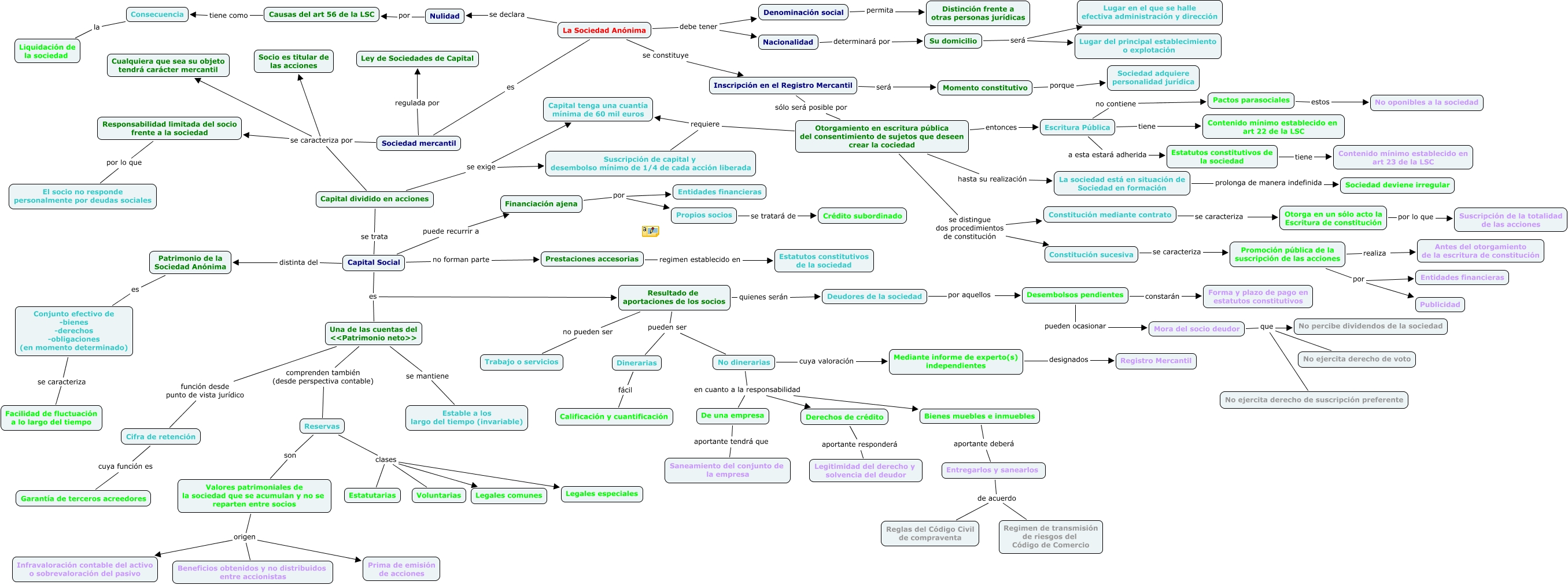 Este Cmap, tiene información relacionada con: Mapa conceptual 2- Sociedad anónima, Otorgamiento en escritura pública del consentimiento de sujetos que deseen crear la cociedad hasta su realización La sociedad está en situación de Sociedad en formación, Reservas clases Voluntarias, Mora del socio deudor que No ejercita derecho de suscripción preferente, Resultado de aportaciones de los socios pueden ser Dinerarias, Su domicilio será Lugar del principal establecimiento o explotación, Mediante informe de experto(s) independientes designados Registro Mercantil, Nacionalidad determinará por Su domicilio, Conjunto efectivo de -bienes -derechos -obligaciones (en momento determinado) se caracteriza Facilidad de fluctuación a lo largo del tiempo, Reservas clases Legales especiales, La Sociedad Anónima es Sociedad mercantil, Reservas son Valores patrimoniales de la sociedad que se acumulan y no se reparten entre socios, Sociedad mercantil se caracteriza por Capital dividido en acciones, Promoción pública de la suscripción de las acciones realiza Antes del otorgamiento de la escritura de constitución, Capital Social distinta del Patrimonio de la Sociedad Anónima, Constitución mediante contrato se caracteriza Otorga en un sólo acto la Escritura de constitución, Derechos de crédito aportante responderá Legitimidad del derecho y solvencia del deudor, Una de las cuentas del <<Patrimonio neto>> comprenden también (desde perspectiva contable) Reservas, Consecuencia la Liquidación de la sociedad, Capital Social puede recurrir a Financiación ajena, Entregarlos y sanearlos de acuerdo Reglas del Código Civil de compraventa