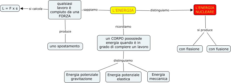 Questa Cmap, creata con IHMC CmapTools, contiene informazioni relative a: L'energia, un CORPO poossiede energia quando è in grado di compiere un lavoro distinguiamo Energia meccanica, L'ENERGIA distinguiamo L'ENERGIA NUCLEARE, L'ENERGIA NUCLEARE si produce con fissione, un CORPO poossiede energia quando è in grado di compiere un lavoro distinguiamo Energia potenziale elastica, qualsiasi lavoro è compiuto da una FORZA produce uno spostamento, L'ENERGIA ricordiamo un CORPO poossiede energia quando è in grado di compiere un lavoro, L'ENERGIA NUCLEARE si produce con fusione, un CORPO poossiede energia quando è in grado di compiere un lavoro distinguiamo Energia potenziale gravitazione, qualsiasi lavoro è compiuto da una FORZA si calcola L = F x s, L'ENERGIA sappiamo qualsiasi lavoro è compiuto da una FORZA
