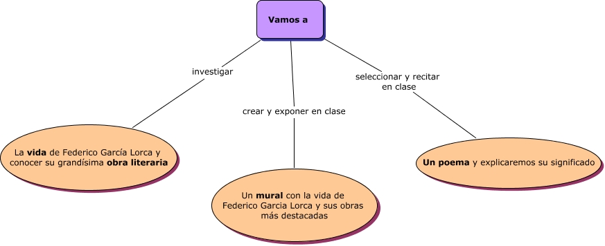 This Concept Map, created with IHMC CmapTools, has information related to: tarea, Vamos a seleccionar y recitar en clase Un poema y explicaremos su significado, Vamos a investigar La vida de Federico García Lorca y conocer su grandísima obra literaria, Vamos a crear y exponer en clase Un mural con la vida de Federico Garcia Lorca y sus obras más destacadas