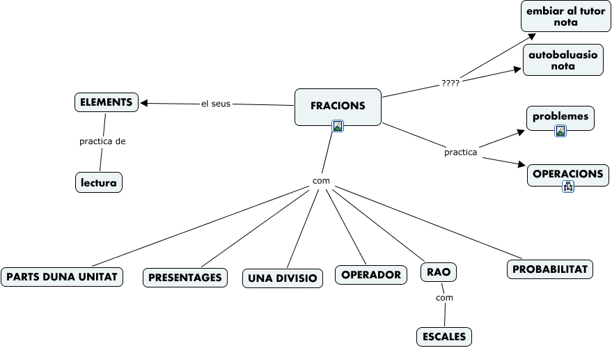 Este Cmap, tiene información relacionada con: T5 fraccions, FRACIONS com OPERADOR, FRACIONS com UNA DIVISIO, FRACIONS el seus ELEMENTS, FRACIONS com PRESENTAGES, FRACIONS ???? autobaluasio nota, ELEMENTS practica de lectura, FRACIONS practica OPERACIONS, FRACIONS com RAO, RAO com ESCALES, FRACIONS practica problemes, FRACIONS ???? embiar al tutor nota, FRACIONS com PROBABILITAT, FRACIONS com PARTS DUNA UNITAT