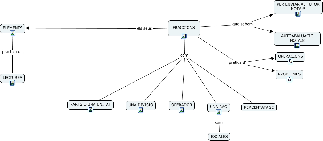 Este Cmap, tiene información relacionada con: T5 FRACCIONS, ELEMENTS practica de LECTUREA, FRACCIONS que sabem PER ENVIAR AL TUTOR NOTA:5, UNA RAO com ESCALES, FRACCIONS com PARTS D'UNA UNITAT, FRACCIONS com PERCENTATAGE, FRACCIONS com UNA DIVISIO, FRACCIONS pratica d' OPERACIONS, FRACCIONS que sabem AUTOABALUACIO NOTA:8, FRACCIONS com UNA RAO, FRACCIONS els seus ELEMENTS, FRACCIONS pratica d' PROBLEMES, FRACCIONS com OPERADOR