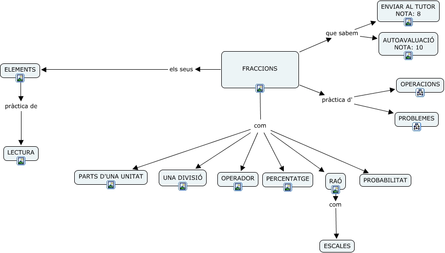 Este Cmap, tiene información relacionada con: T5 FRACCIONS, ELEMENTS pràctica de LECTURA, FRACCIONS pràctica d' OPERACIONS, FRACCIONS els seus ELEMENTS, FRACCIONS com UNA DIVISIÓ, FRACCIONS com PARTS D'UNA UNITAT, FRACCIONS com RAÓ, FRACCIONS pràctica d' PROBLEMES, FRACCIONS que sabem AUTOAVALUACIÓ NOTA: 10, FRACCIONS com OPERADOR, FRACCIONS com PERCENTATGE, RAÓ com ESCALES, FRACCIONS com PROBABILITAT, FRACCIONS que sabem ENVIAR AL TUTOR NOTA: 8