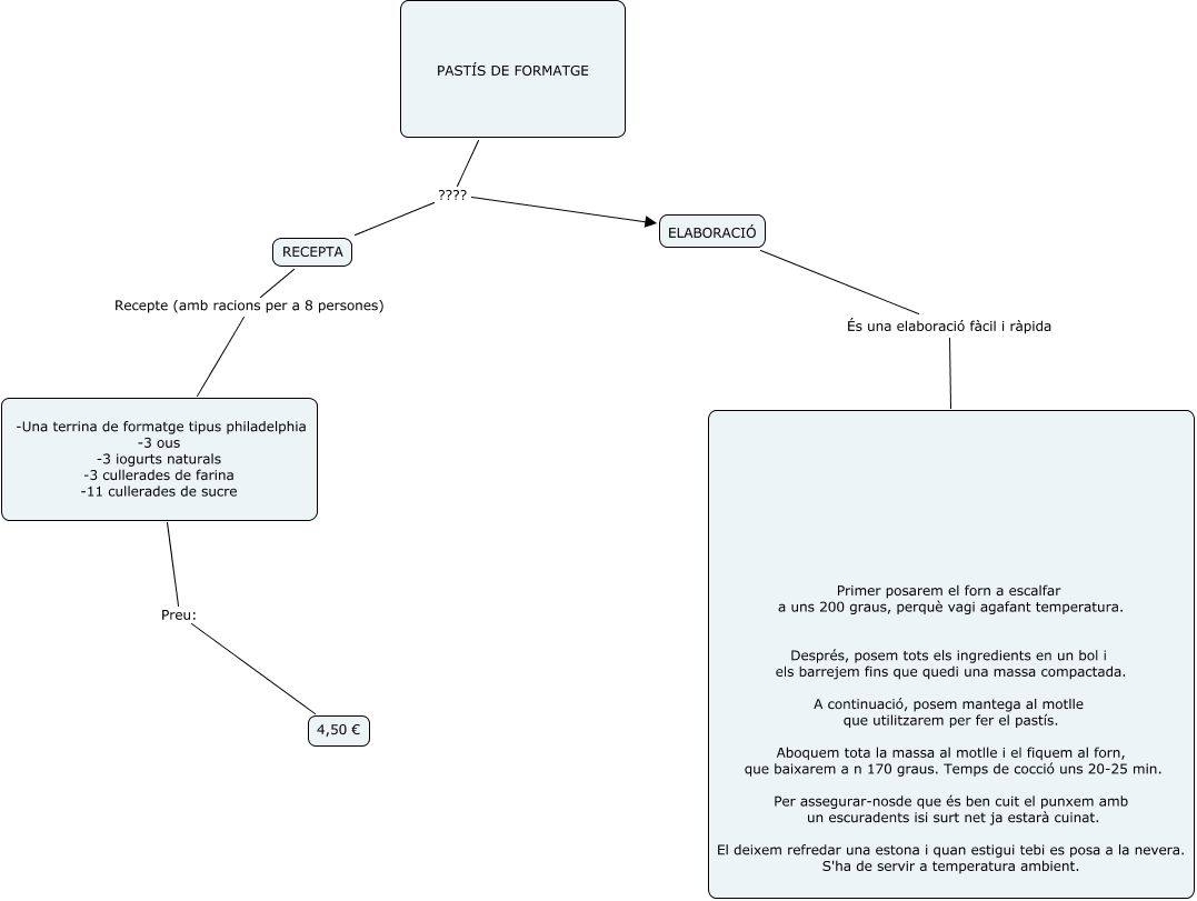 Este Cmap, tiene información relacionada con: PROJECTE PASTÍS DE FORMATGE, -Una terrina de formatge tipus philadelphia -3 ous -3 iogurts naturals -3 cullerades de farina -11 cullerades de sucre Preu: 4,50 €, RECEPTA Recepte (amb racions per a 8 persones) -Una terrina de formatge tipus philadelphia -3 ous -3 iogurts naturals -3 cullerades de farina -11 cullerades de sucre, ELABORACIÓ És una elaboració fàcil i ràpida Primer posarem el forn a escalfar a uns 200 graus, perquè vagi agafant temperatura. Després, posem tots els ingredients en un bol i els barrejem fins que quedi una massa compactada. A continuació, posem mantega al motlle que utilitzarem per fer el pastís. Aboquem tota la massa al motlle i el fiquem al forn, que baixarem a n 170 graus. Temps de cocció uns 20-25 min. Per assegurar-nosde que és ben cuit el punxem amb un escuradents isi surt net ja estarà cuinat. El deixem refredar una estona i quan estigui tebi es posa a la nevera. S'ha de servir a temperatura ambient., PASTÍS DE FORMATGE ???? ELABORACIÓ, PASTÍS DE FORMATGE ???? RECEPTA