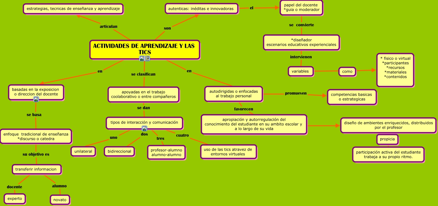 Este Cmap, tiene información relacionada con: capitulo 7 crimi, tipos de interacción y comunicación cuatro uso de las tics atravez de entornos virtuales, ACTIVIDADES DE APRENDIZAJE Y LAS TICS articulan estrategias, tecnicas de enseñanza y aprendizaje, ACTIVIDADES DE APRENDIZAJE Y LAS TICS en basadas en la exposicion o direccion del docente, ACTIVIDADES DE APRENDIZAJE Y LAS TICS se clasifican apoyadas en el trabajo coolaborativo o entre compañeros, ACTIVIDADES DE APRENDIZAJE Y LAS TICS son autenticas: inéditas e innovadoras, papel del docente *guia o moderador se convierte *diseñador escenarios educativos experienciales, basadas en la exposicion o direccion del docente se basa enfoque tradicional de enseñanza *discurso o catedra, tipos de interacción y comunicación tres profesor-alumno alumno-alumno, apropiación y autorregulación del conocimiento del estudiante en su ambito escolar y a lo largo de su vida ???? diseño de ambientes enriquecidos, distribuidos por el profesor, transferir informacion docente experto, *diseñador escenarios educativos experienciales intervienen variables, transferir informacion alumno novato, autodirigidas o enfocadas al trabajo personal promueven competencias basicas o estrategicas, autenticas: inéditas e innovadoras el papel del docente *guia o moderador, diseño de ambientes enriquecidos, distribuidos por el profesor participación activa del estudiante trabaja a su propio ritmo., variables * fisico o virtual *participantes *recursos *materiales *contenidos, tipos de interacción y comunicación uno unilateral, ACTIVIDADES DE APRENDIZAJE Y LAS TICS en autodirigidas o enfocadas al trabajo personal, autodirigidas o enfocadas al trabajo personal favorecen apropiación y autorregulación del conocimiento del estudiante en su ambito escolar y a lo largo de su vida, enfoque tradicional de enseñanza *discurso o catedra su objetivo es transferir informacion