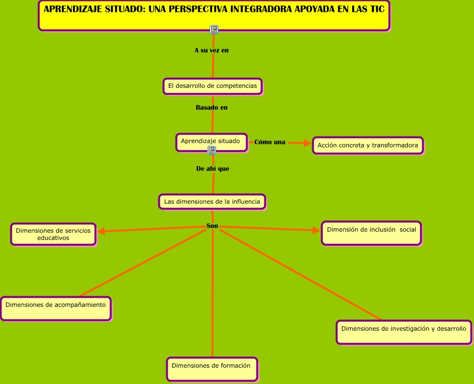 Este Cmap, tiene información relacionada con: CMAPS CAPITULO 11, Las dimensiones de la influencia Son Dimensiones de formación, Aprendizaje situado Cómo una Acción concreta y transformadora, Las dimensiones de la influencia Son Dimensiones de acompañamiento, Las dimensiones de la influencia Son Dimensiones de servicios educativos, Aprendizaje situado De ahí que Las dimensiones de la influencia, Las dimensiones de la influencia Son Dimensiones de investigación y desarrollo, El desarrollo de competencias Basado en Aprendizaje situado, APRENDIZAJE SITUADO: UNA PERSPECTIVA INTEGRADORA APOYADA EN LAS TIC A su vez en El desarrollo de competencias, Las dimensiones de la influencia Son Dimensión de inclusión social
