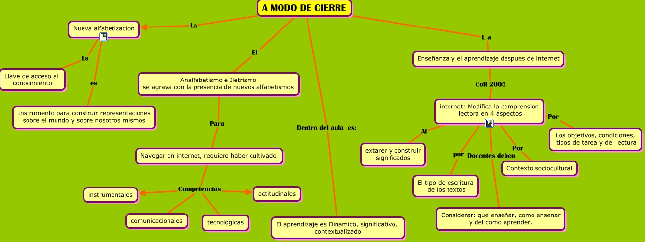 Este Cmap, tiene información relacionada con: Capitulo 14Idalia, Analfabetismo e Iletrismo se agrava con la presencia de nuevos alfabetismos Para Navegar en internet, requiere haber cultivado, A MODO DE CIERRE El Analfabetismo e Iletrismo se agrava con la presencia de nuevos alfabetismos, Navegar en internet, requiere haber cultivado Competencias tecnologicas, Navegar en internet, requiere haber cultivado Competencias actitudinales, Enseñanza y el aprendizaje despues de internet Coll 2005 internet: Modifica la comprension lectora en 4 aspectos, internet: Modifica la comprension lectora en 4 aspectos Por Los objetivos, condiciones, tipos de tarea y de lectura, A MODO DE CIERRE L a Enseñanza y el aprendizaje despues de internet, Nueva alfabetizacion es Instrumento para construir representaciones sobre el mundo y sobre nosotros mismos, internet: Modifica la comprension lectora en 4 aspectos Al extarer y construir significados, A MODO DE CIERRE La Nueva alfabetizacion, Navegar en internet, requiere haber cultivado Competencias instrumentales, internet: Modifica la comprension lectora en 4 aspectos Por Contexto sociocultural, internet: Modifica la comprension lectora en 4 aspectos Docentes deben Considerar: que enseñar, como ensenar y del como aprender., Navegar en internet, requiere haber cultivado Competencias comunicacionales, Nueva alfabetizacion Es Llave de acceso al conocimiento, internet: Modifica la comprension lectora en 4 aspectos por El tipo de escritura de los textos, A MODO DE CIERRE Dentro del aula es: El aprendizaje es Dinamico, significativo, contextualizado