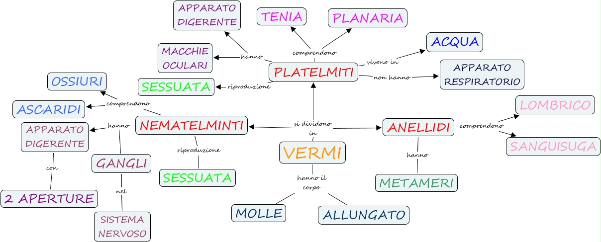 Questa Cmap, creata con IHMC CmapTools, contiene informazioni relative a: VERMI, VERMI si dividono in NEMATELMINTI, ANELLIDI comprendono LOMBRICO, PLATELMITI hanno MACCHIE OCULARI, PLATELMITI hanno APPARATO DIGERENTE, VERMI si dividono in ANELLIDI, NEMATELMINTI riproduzione SESSUATA, NEMATELMINTI comprendono ASCARIDI, PLATELMITI comprendono PLANARIA, PLATELMITI riproduzione SESSUATA, NEMATELMINTI hanno GANGLI, PLATELMITI vivono in ACQUA, VERMI hanno il corpo ALLUNGATO, VERMI hanno il corpo MOLLE, PLATELMITI non hanno APPARATO RESPIRATORIO, PLATELMITI comprendono TENIA, NEMATELMINTI comprendono OSSIURI, VERMI si dividono in PLATELMITI, ANELLIDI hanno METAMERI, NEMATELMINTI hanno APPARATO DIGERENTE, APPARATO DIGERENTE con 2 APERTURE