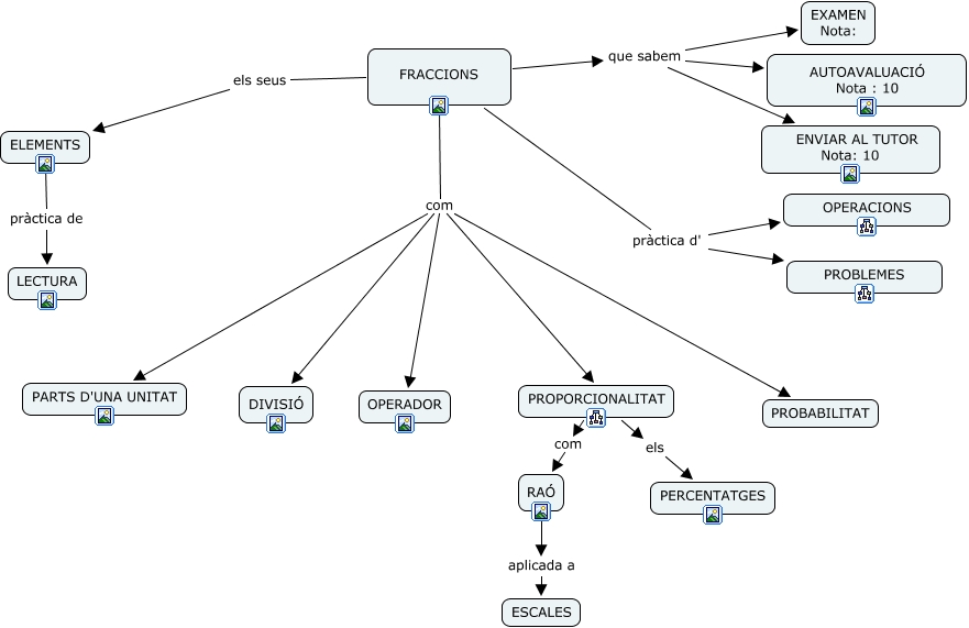 Aquest mapa conceptual conté informació relacionada amb: T5·6 FRACCIONS, FRACCIONS com PROPORCIONALITAT, FRACCIONS com PROBABILITAT, FRACCIONS que sabem AUTOAVALUACIÓ Nota : 10, PROPORCIONALITAT com RAÓ, PROPORCIONALITAT els PERCENTATGES, FRACCIONS com PARTS D'UNA UNITAT, FRACCIONS que sabem ENVIAR AL TUTOR Nota: 10, ELEMENTS pràctica de LECTURA, RAÓ aplicada a ESCALES, FRACCIONS com DIVISIÓ, FRACCIONS els seus ELEMENTS, FRACCIONS com OPERADOR, FRACCIONS que sabem EXAMEN Nota:, FRACCIONS pràctica d' PROBLEMES, FRACCIONS pràctica d' OPERACIONS