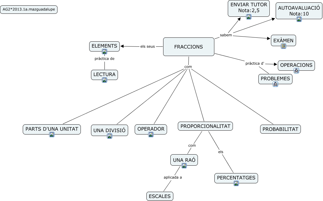 Este Cmap, tiene información relacionada con: T5 FRACCIONS AG2, FRACCIONS sabem ENVIAR TUTOR Nota:2,5, FRACCIONS com OPERADOR, UNA RAÓ aplicada a ESCALES, FRACCIONS sabem EXÀMEN, PROPORCIONALITAT com UNA RAÓ, FRACCIONS els seus ELEMENTS, ELEMENTS pràctica de LECTURA, FRACCIONS com PARTS D'UNA UNITAT, FRACCIONS com PROPORCIONALITAT, FRACCIONS com UNA DIVISIÓ, PROPORCIONALITAT els PERCENTATGES, FRACCIONS pràctica d' PROBLEMES, FRACCIONS sabem AUTOAVALUACIÓ Nota:10, FRACCIONS pràctica d' OPERACIONS, FRACCIONS com PROBABILITAT