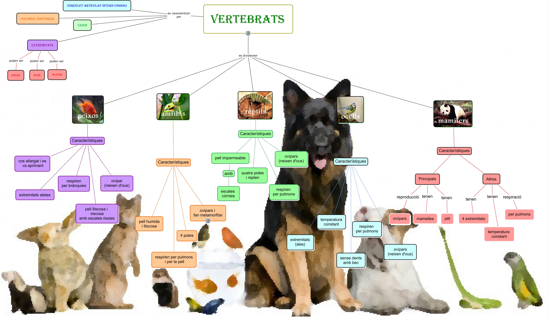 Este Cmap, tiene información relacionada con: Mapa conceptual dels vertebrats, VERTEBRATS es caracteritzen per crani, rèptils Característiques quatre potes i repten, Principals reproducció vivípars, VERTEBRATS es divideixen peixos, rèptils Característiques respiren per pulmons, peixos Característiques pell lliscosa i viscosa amb escates òssies, amfibis Característiques ovípars i fan metamorfòsi, ocells Característiques ovípars (neixen d'ous), ocells Característiques temperatura constant, Altres tenen temperatura constant, VERTEBRATS es caracteritzen per extremitats, amfibis Característiques 4 potes, ocells Característiques extremitats (ales), peixos Característiques cos allargat i es va aprimant, VERTEBRATS es divideixen ocells, rèptils Característiques pell impermeable, Principals tenen mamelles, VERTEBRATS es caracteritzen per esquelet articulat intern (ossos), peixos Característiques extremitats aletes, ocells Característiques respiren per pulmons