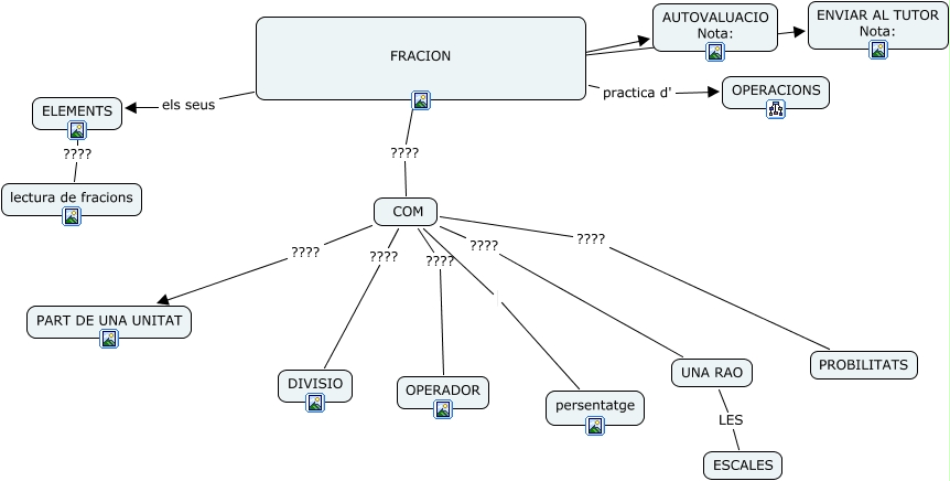 Este Cmap, tiene información relacionada con: CG2, FRACION ???? ENVIAR AL TUTOR Nota:, FRACION els seus ELEMENTS, COM ???? DIVISIO, ELEMENTS ???? lectura de fracions, FRACION ???? COM, COM ???? OPERADOR, COM ???? PART DE UNA UNITAT, COM ???? UNA RAO, UNA RAO LES ESCALES, FRACION ???? AUTOVALUACIO Nota:, COM persentatge, FRACION practica d' OPERACIONS, COM ???? PROBILITATS