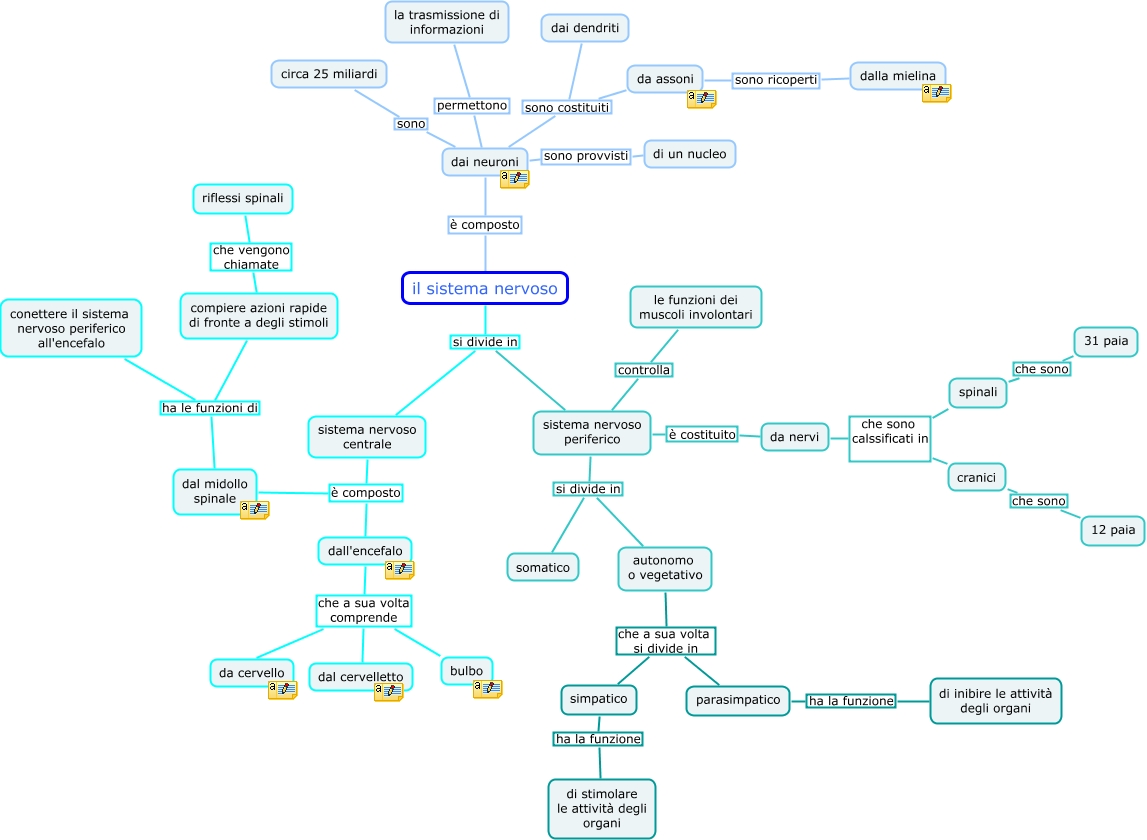 Questa Cmap, creata con IHMC CmapTools, contiene informazioni relative a: il sistema nervoso, da nervi che sono calssificati in cranici, dall'encefalo che a sua volta comprende bulbo, autonomo o vegetativo che a sua volta si divide in simpatico, parasimpatico ha la funzione di inibire le attività degli organi, sistema nervoso periferico si divide in autonomo o vegetativo, dai neuroni sono circa 25 miliardi, cranici che sono 12 paia, dal midollo spinale ha le funzioni di compiere azioni rapide di fronte a degli stimoli, sistema nervoso centrale è composto dall'encefalo, sistema nervoso periferico si divide in somatico, sistema nervoso periferico controlla le funzioni dei muscoli involontari, da assoni sono ricoperti dalla mielina, dai neuroni sono costituiti da assoni, dai neuroni sono provvisti di un nucleo, sistema nervoso periferico è costituito da nervi, dall'encefalo che a sua volta comprende da cervello, spinali che sono 31 paia, il sistema nervoso si divide in sistema nervoso periferico, da nervi che sono calssificati in spinali, dall'encefalo che a sua volta comprende dal cervelletto
