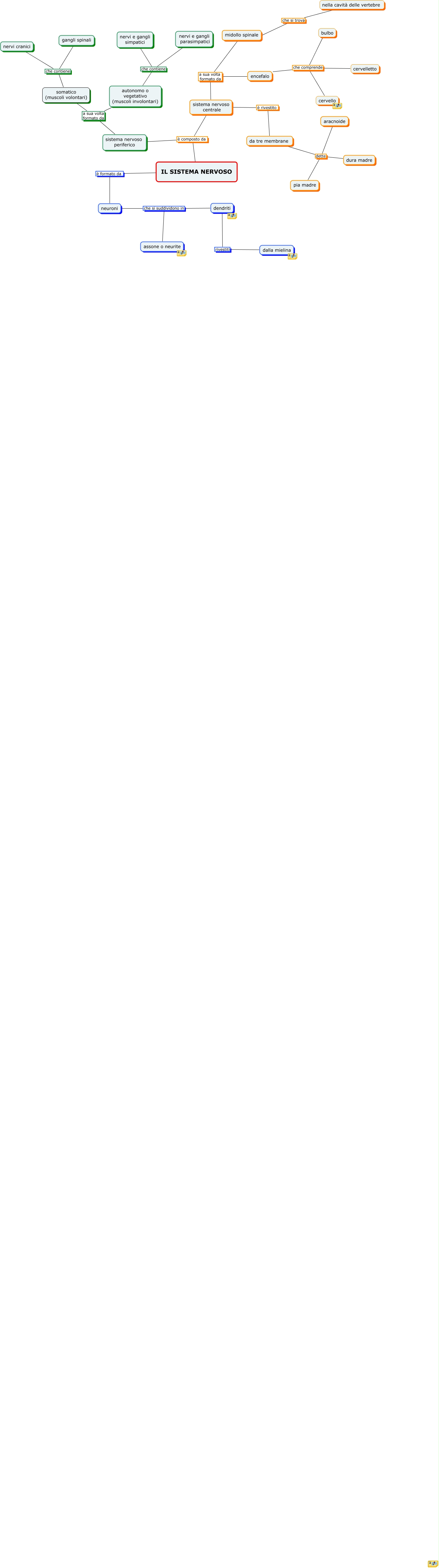 Questa Cmap, creata con IHMC CmapTools, contiene informazioni relative a: Il sistema nervoso, da tre membrane dette aracnoide, somatico (muscoli volontari) che contiene gangli spinali, cervelletto che comprende cervello, midollo spinale che si trova nella cavità delle vertebre, da tre membrane dette pia madre, IL SISTEMA NERVOSO è composto da sistema nervoso centrale, sistema nervoso centrale a sua volta formato da midollo spinale, cervelletto che comprende encefalo, dendriti rivestiti dalla mielina, cervelletto che comprende bulbo, sistema nervoso periferico a sua volta formato da somatico (muscoli volontari), autonomo o vegetativo (muscoli involontari) che contiene nervi e gangli simpatici, assone o neurite che si suddividono in dendriti, sistema nervoso periferico a sua volta formato da autonomo o vegetativo (muscoli involontari), IL SISTEMA NERVOSO è formato da neuroni, da tre membrane dette dura madre, somatico (muscoli volontari) che contiene nervi cranici, sistema nervoso centrale a sua volta formato da encefalo, IL SISTEMA NERVOSO è composto da sistema nervoso periferico, sistema nervoso centrale è rivestito da tre membrane