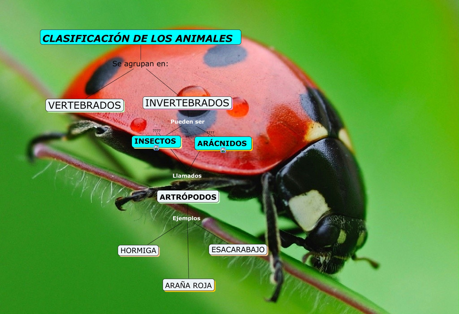 Este Cmap, tiene información relacionada con: TAREA SUPERADA, CLASIFICACIÓN DE LOS ANIMALES Se agrupan en: VERTEBRADOS, ARTRÓPODOS Ejemplos HORMIGA, CLASIFICACIÓN DE LOS ANIMALES Se agrupan en: INVERTEBRADOS, ARTRÓPODOS Ejemplos ARAÑA ROJA, ARTRÓPODOS Ejemplos ESACARABAJO, INSECTOS ???? Llamados, INVERTEBRADOS Pueden ser INSECTOS, ARÁCNIDOS ???? Llamados, INVERTEBRADOS Pueden ser ARÁCNIDOS