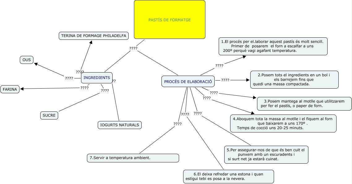 Este Cmap, tiene información relacionada con: CG3 Projecte Pastís Formatge, PROCÈS DE ELABORACIÓ ???? 4.Aboquem tota la massa al motlle i el fiquem al forn que baixarem a uns 170º . Temps de cocció uns 20-25 minuts., PROCÈS DE ELABORACIÓ ???? 3.Posem mantega al motlle que utilitzarem per fer el pastís, o paper de forn., PROCÈS DE ELABORACIÓ ???? 6.El deixa refredar una estona i quan estigui tebi es posa a la nevera., PASTÍS DE FORMATGE ???? PROCÈS DE ELABORACIÓ, PASTÍS DE FORMATGE ???? INGREDIENTS, INGREDIENTS ???? IOGURTS NATURALS, PROCÈS DE ELABORACIÓ ???? 2.Posem tots el ingredients en un bol i els barrejem fins que quedi una massa compactada., INGREDIENTS ???? OUS, PROCÈS DE ELABORACIÓ ???? 7.Servir a temperatura ambient., INGREDIENTS ???? SUCRE, PROCÈS DE ELABORACIÓ ???? 1.El procés per el.laborar aquest pastís és molt sencill. Primer de posarem el forn a escalfar a uns 200º perquè vagi agafant temperatura., INGREDIENTS ???? FARINA, INGREDIENTS ???? TERINA DE FORMAGE PHILADELFA, PROCÈS DE ELABORACIÓ ???? 5.Per assegurar-nos de que és ben cuit el punxem amb un escuradents i si surt net ja estarà cuinat.