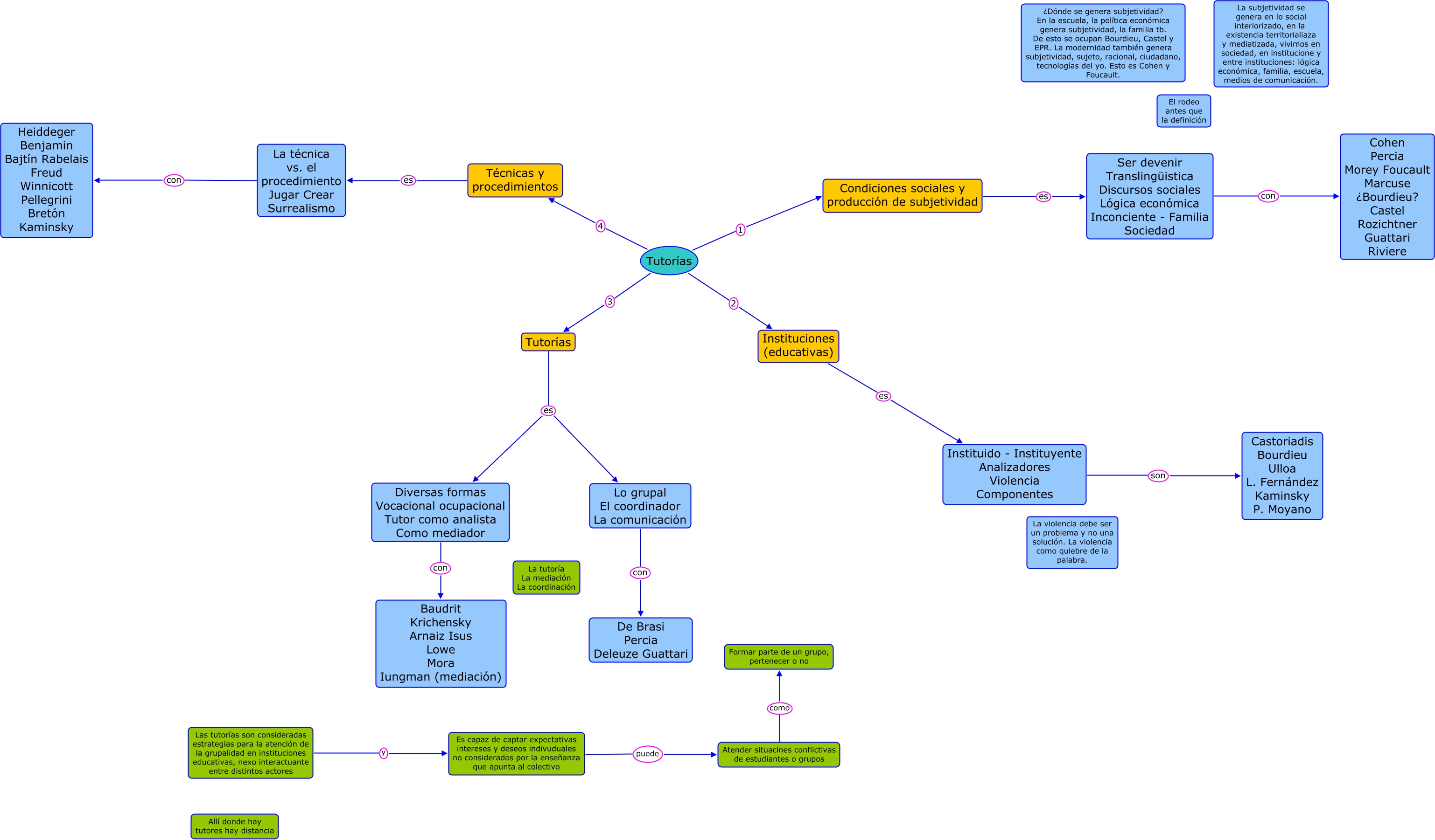 Este Cmap, tiene información relacionada con: Resumen Tutoría, Es capaz de captar expectativas intereses y deseos indivuduales no considerados por la enseñanza que apunta al colectivo puede Atender situacines conflictivas de estudiantes o grupos, Tutorías es Lo grupal El coordinador La comunicación, Lo grupal El coordinador La comunicación con De Brasi Percia Deleuze Guattari, Tutorías 3 Tutorías, Tutorías 4 Técnicas y procedimientos, Condiciones sociales y producción de subjetividad es Ser devenir Translingüistica Discursos sociales Lógica económica Inconciente - Familia Sociedad, Instituido - Instituyente Analizadores Violencia Componentes son Castoriadis Bourdieu Ulloa L. Fernández Kaminsky P. Moyano, Tutorías 2 Instituciones (educativas), Técnicas y procedimientos es La técnica vs. el procedimiento Jugar Crear Surrealismo, Instituciones (educativas) es Instituido - Instituyente Analizadores Violencia Componentes, Atender situacines conflictivas de estudiantes o grupos como Formar parte de un grupo, pertenecer o no, Tutorías es Diversas formas Vocacional ocupacional Tutor como analista Como mediador, Las tutorías son consideradas estrategias para la atención de la grupalidad en instituciones educativas, nexo interactuante entre distintos actores y Es capaz de captar expectativas intereses y deseos indivuduales no considerados por la enseñanza que apunta al colectivo, La técnica vs. el procedimiento Jugar Crear Surrealismo con Heiddeger Benjamin Bajtín Rabelais Freud Winnicott Pellegrini Bretón Kaminsky, Tutorías 1 Condiciones sociales y producción de subjetividad, Diversas formas Vocacional ocupacional Tutor como analista Como mediador con Baudrit Krichensky Arnaiz Isus Lowe Mora Iungman (mediación), Ser devenir Translingüistica Discursos sociales Lógica económica Inconciente - Familia Sociedad con Cohen Percia Morey Foucault Marcuse ¿Bourdieu? Castel Rozichtner Guattari Riviere