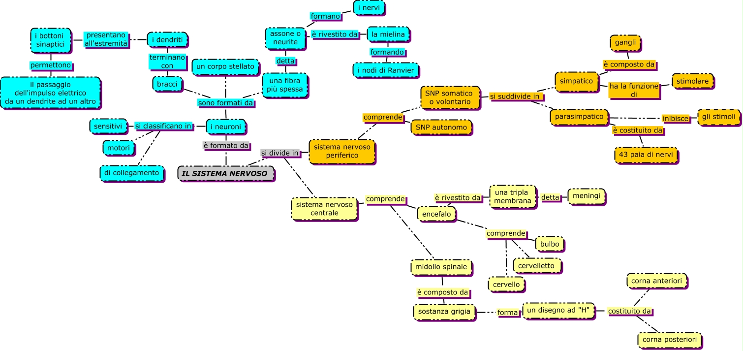 Questa Cmap, creata con IHMC CmapTools, contiene informazioni relative a: SISTEMA NERVOSO, encefalo comprende bulbo, i neuroni sono formati da un corpo stellato, i bottoni sinaptici permettono il passaggio dell'impulso elettrico da un dendrite ad un altro, IL SISTEMA NERVOSO si divide in sistema nervoso periferico, un disegno ad "H" costituito da corna posteriori, IL SISTEMA NERVOSO si divide in sistema nervoso centrale, simpatico ha la funzione di stimolare, i neuroni si classificano in motori, encefalo comprende cervello, parasimpatico è costituito da 43 paia di nervi, sistema nervoso centrale comprende midollo spinale, assone o neurite formano i nervi, parasimpatico inibisce gli stimoli, una fibra più spessa detta assone o neurite, simpatico è composto da gangli, la mielina formando i nodi di Ranvier, i neuroni sono formati da una fibra più spessa, i neuroni sono formati da bracci, sistema nervoso periferico comprende SNP autonomo, encefalo comprende cervelletto