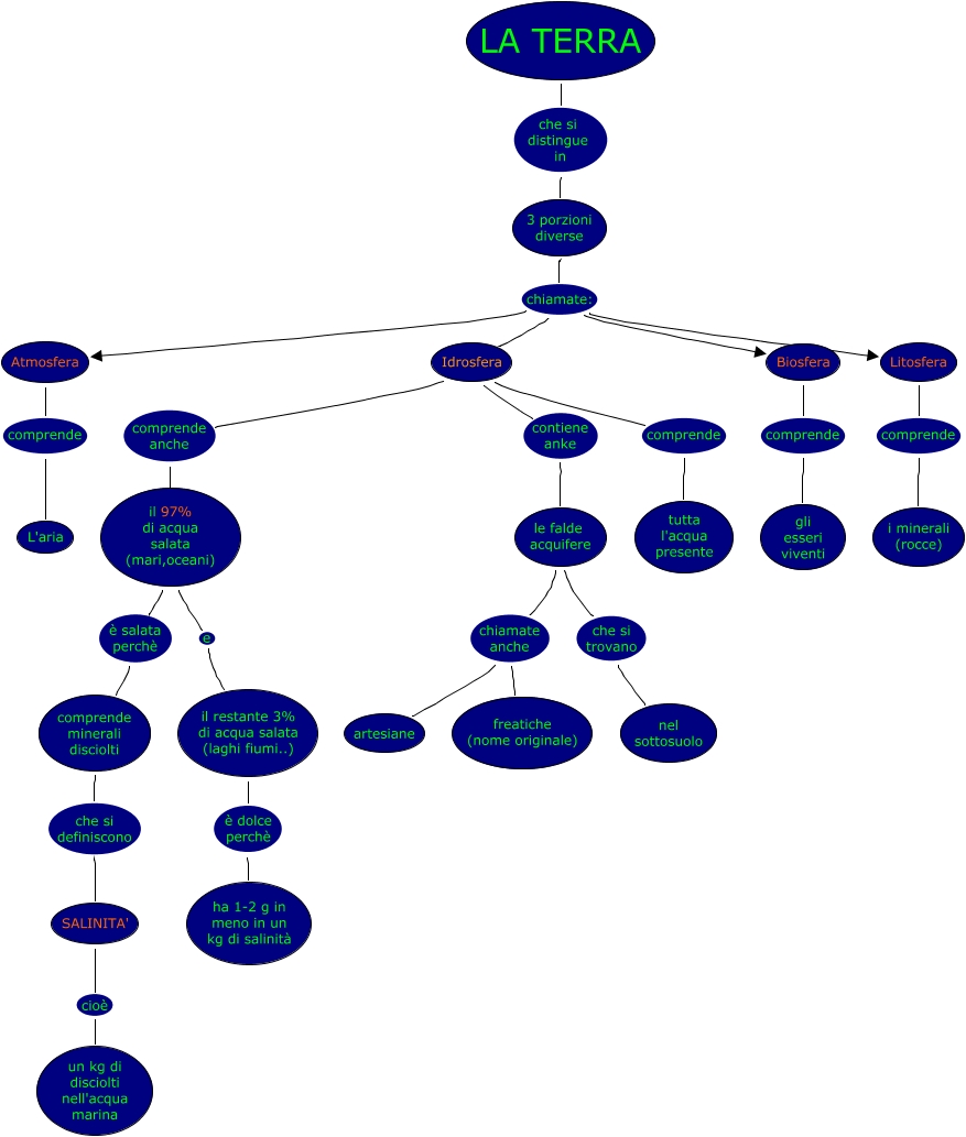 Questa Cmap, creata con IHMC CmapTools, contiene informazioni relative a: LA TERRA, le falde acquifere che si trovano nel sottosuolo, il 97% di acqua salata (mari,oceani) e il restante 3% di acqua salata (laghi fiumi..), Idrosfera comprende anche il 97% di acqua salata (mari,oceani), Litosfera comprende i minerali (rocce), LA TERRA che si distingue in 3 porzioni diverse, il 97% di acqua salata (mari,oceani) è salata perchè comprende minerali disciolti, 3 porzioni diverse chiamate: Atmosfera, Biosfera comprende gli esseri viventi, SALINITA' cioè un kg di disciolti nell'acqua marina, le falde acquifere chiamate anche artesiane, 3 porzioni diverse chiamate: Litosfera, il restante 3% di acqua salata (laghi fiumi..) è dolce perchè ha 1-2 g in meno in un kg di salinità, comprende minerali disciolti che si definiscono SALINITA', Idrosfera contiene anke le falde acquifere, le falde acquifere chiamate anche freatiche (nome originale), 3 porzioni diverse chiamate: Biosfera, Idrosfera comprende tutta l'acqua presente, Atmosfera comprende L'aria, 3 porzioni diverse chiamate: Idrosfera