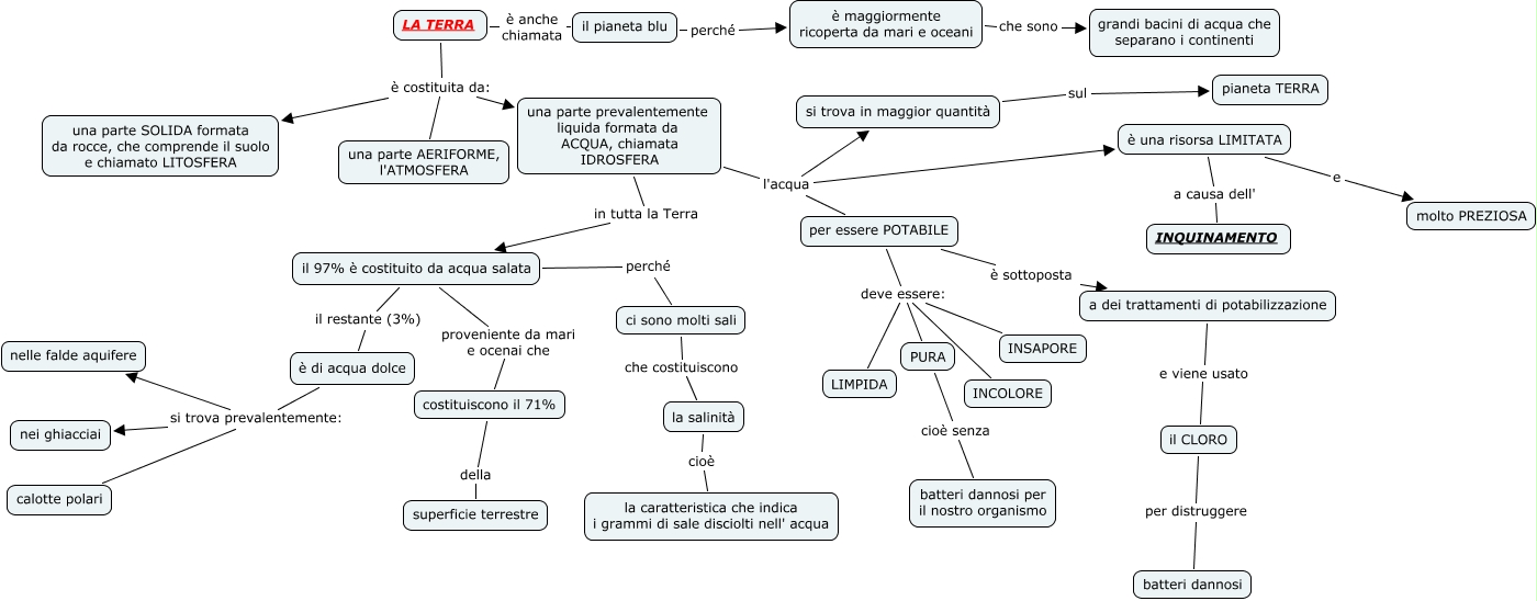Questa Cmap, creata con IHMC CmapTools, contiene informazioni relative a: La Terra e L'Acqua, è di acqua dolce si trova prevalentemente: nelle falde aquifere, una parte prevalentemente liquida formata da ACQUA, chiamata IDROSFERA l'acqua è una risorsa LIMITATA, la salinità cioè la caratteristica che indica i grammi di sale disciolti nell' acqua, per essere POTABILE è sottoposta a dei trattamenti di potabilizzazione, è una risorsa LIMITATA a causa dell' INQUINAMENTO, è di acqua dolce si trova prevalentemente: nei ghiacciai, LA TERRA è costituita da: una parte SOLIDA formata da rocce, che comprende il suolo e chiamato LITOSFERA, per essere POTABILE deve essere: INCOLORE, il 97% è costituito da acqua salata proveniente da mari e ocenai che costituiscono il 71%, LA TERRA è costituita da: una parte AERIFORME, l'ATMOSFERA, per essere POTABILE deve essere: INSAPORE, per essere POTABILE deve essere: LIMPIDA, a dei trattamenti di potabilizzazione e viene usato il CLORO, il CLORO per distruggere batteri dannosi, LA TERRA è anche chiamata il pianeta blu, una parte prevalentemente liquida formata da ACQUA, chiamata IDROSFERA l'acqua per essere POTABILE, per essere POTABILE deve essere: PURA, PURA cioè senza batteri dannosi per il nostro organismo, è di acqua dolce si trova prevalentemente: calotte polari, il 97% è costituito da acqua salata perché ci sono molti sali