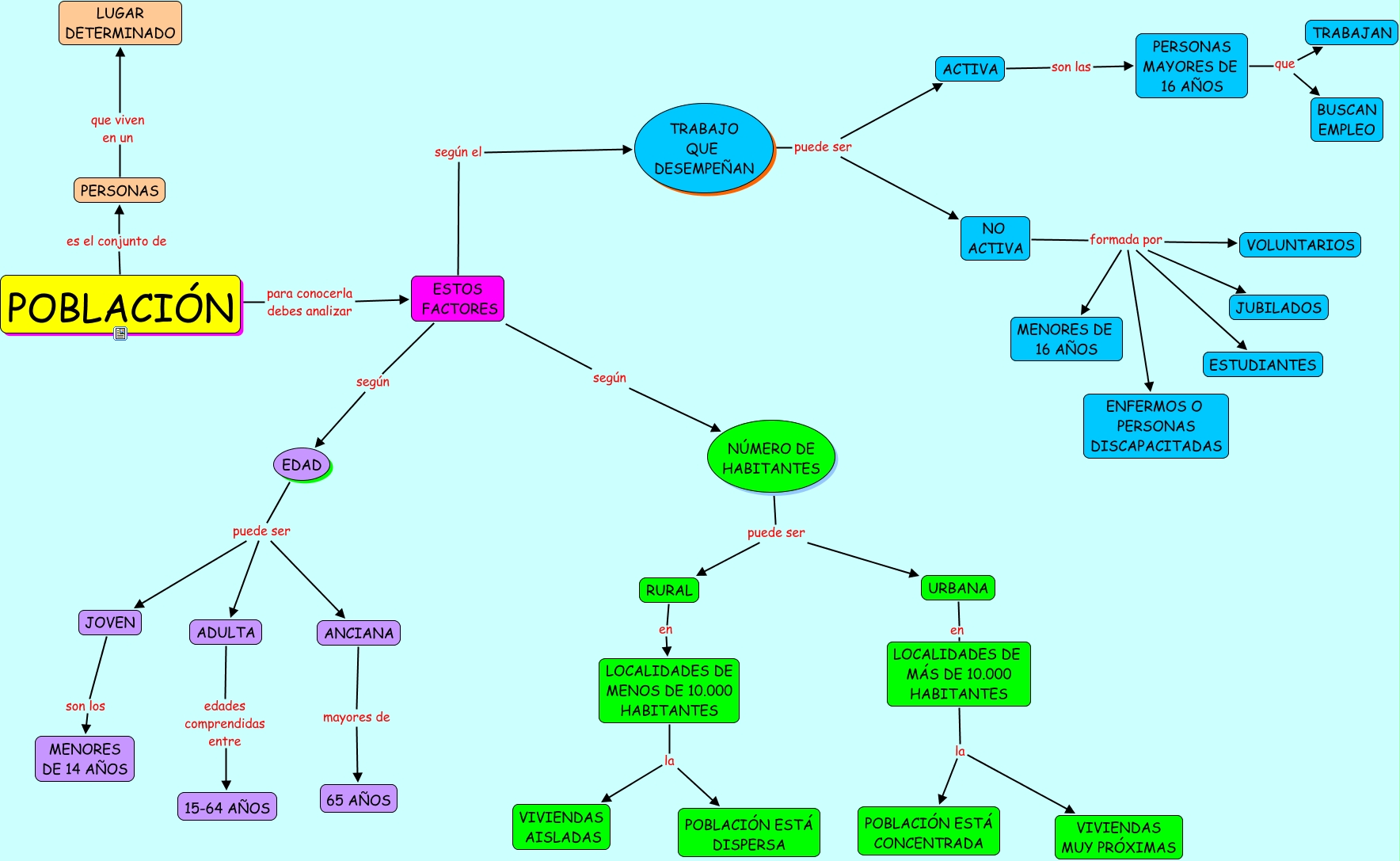 Este Cmap, tiene información relacionada con: POBLACIÓN, NO ACTIVA formada por VOLUNTARIOS, NÚMERO DE HABITANTES puede ser RURAL, NO ACTIVA formada por MENORES DE 16 AÑOS, EDAD puede ser JOVEN, PERSONAS que viven en un LUGAR DETERMINADO, ACTIVA son las PERSONAS MAYORES DE 16 AÑOS, LOCALIDADES DE MENOS DE 10.000 HABITANTES la POBLACIÓN EST�? DISPERSA, ANCIANA mayores de 65 AÑOS, TRABAJO QUE DESEMPEÑAN puede ser ACTIVA, ADULTA edades comprendidas entre 15-64 AÑOS, POBLACIÓN es el conjunto de PERSONAS, PERSONAS MAYORES DE 16 AÑOS que BUSCAN EMPLEO, JOVEN son los MENORES DE 14 AÑOS, ESTOS FACTORES según EDAD, NO ACTIVA formada por ENFERMOS O PERSONAS DISCAPACITADAS, ESTOS FACTORES según NÚMERO DE HABITANTES, LOCALIDADES DE MENOS DE 10.000 HABITANTES la VIVIENDAS AISLADAS, POBLACIÓN para conocerla debes analizar ESTOS FACTORES, PERSONAS MAYORES DE 16 AÑOS que TRABAJAN, NO ACTIVA formada por JUBILADOS