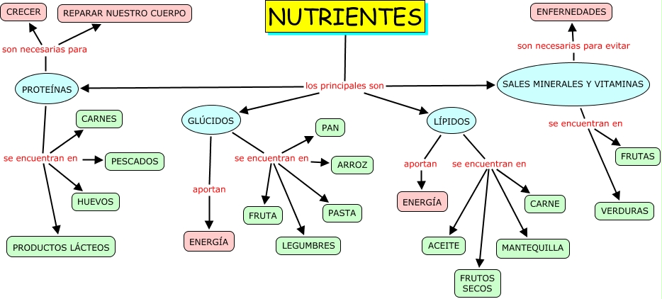Este Cmap, tiene información relacionada con: NUTRIENTES, SALES MINERALES Y VITAMINAS son necesarias para evitar ENFERNEDADES, GLÚCIDOS aportan ENERG�?A, NUTRIENTES los principales son L�?PIDOS, SALES MINERALES Y VITAMINAS se encuentran en VERDURAS, L�?PIDOS aportan ENERG�?A, GLÚCIDOS se encuentran en ARROZ, NUTRIENTES los principales son SALES MINERALES Y VITAMINAS, L�?PIDOS se encuentran en ACEITE, GLÚCIDOS se encuentran en PASTA, NUTRIENTES los principales son PROTE�?NAS, PROTE�?NAS son necesarias para REPARAR NUESTRO CUERPO, PROTE�?NAS son necesarias para CRECER, SALES MINERALES Y VITAMINAS se encuentran en FRUTAS, GLÚCIDOS se encuentran en PAN, L�?PIDOS se encuentran en CARNE, PROTE�?NAS se encuentran en PRODUCTOS L�?CTEOS, NUTRIENTES los principales son GLÚCIDOS, PROTE�?NAS se encuentran en CARNES, PROTE�?NAS se encuentran en HUEVOS, PROTE�?NAS se encuentran en PESCADOS