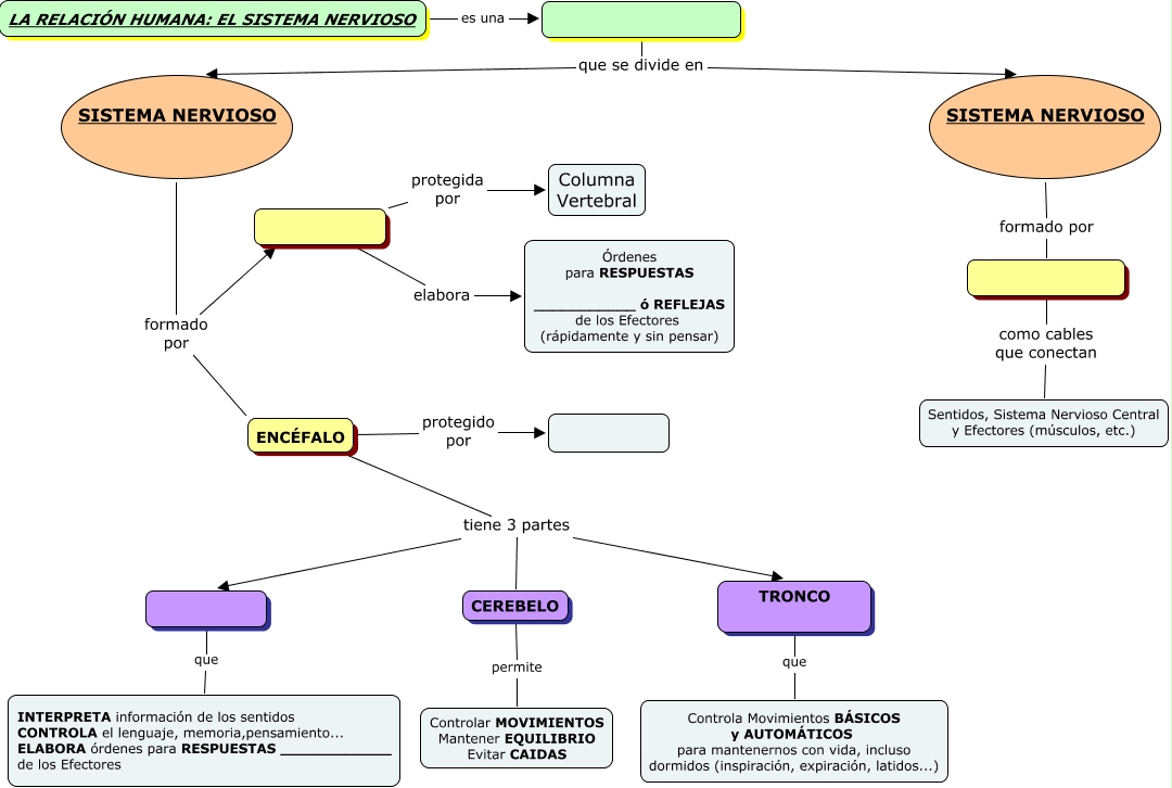 Este Cmap, tiene información relacionada con: LA RELACIÓN HUMANA - EL SISTEMA NERVIOSO - MUDO, SISTEMA NERVIOSO formado por ENCÉFALO, SISTEMA NERVIOSO formado por, elabora Órdenes para RESPUESTAS ___________ ó REFLEJAS de los Efectores (rápidamente y sin pensar), CEREBELO permite Controlar MOVIMIENTOS Mantener EQUILIBRIO Evitar CAIDAS, LA RELACIÓN HUMANA: EL SISTEMA NERVIOSO es una, TRONCO que Controla Movimientos B�?SICOS y AUTOM�?TICOS para mantenernos con vida, incluso dormidos (inspiración, expiración, latidos...), ENCÉFALO tiene 3 partes CEREBELO, que se divide en SISTEMA NERVIOSO, ENCÉFALO tiene 3 partes, ENCÉFALO tiene 3 partes TRONCO, ENCÉFALO protegido por, que se divide en SISTEMA NERVIOSO, protegida por Columna Vertebral, como cables que conectan Sentidos, Sistema Nervioso Central y Efectores (músculos, etc.), SISTEMA NERVIOSO formado por, que INTERPRETA información de los sentidos CONTROLA el lenguaje, memoria,pensamiento... ELABORA órdenes para RESPUESTAS ____________ de los Efectores