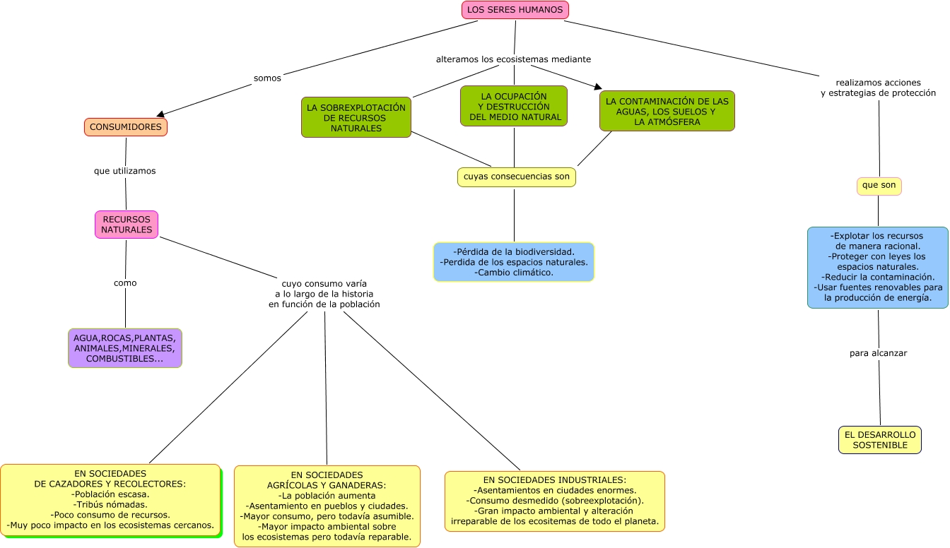 Este Cmap, tiene información relacionada con: LOS SERES HUMANOS.cmap, LOS SERES HUMANOS realizamos acciones y estrategias de protección que son, LA OCUPACIÓN Y DESTRUCCIÓN DEL MEDIO NATURAL ???? -Pérdida de la biodiversidad. -Perdida de los espacios naturales. -Cambio climático., RECURSOS NATURALES cuyo consumo varía a lo largo de la historia en función de la población EN SOCIEDADES INDUSTRIALES: -Asentamientos en ciudades enormes. -Consumo desmedido (sobreexplotación). -Gran impacto ambiental y alteración irreparable de los ecositemas de todo el planeta., LOS SERES HUMANOS somos CONSUMIDORES, CONSUMIDORES que utilizamos RECURSOS NATURALES, RECURSOS NATURALES como AGUA,ROCAS,PLANTAS, ANIMALES,MINERALES, COMBUSTIBLES..., que son ???? -Explotar los recursos de manera racional. -Proteger con leyes los espacios naturales. -Reducir la contaminación. -Usar fuentes renovables para la producción de energía., -Explotar los recursos de manera racional. -Proteger con leyes los espacios naturales. -Reducir la contaminación. -Usar fuentes renovables para la producción de energía. para alcanzar EL DESARROLLO SOSTENIBLE, LA CONTAMINACIÓN DE LAS AGUAS, LOS SUELOS Y LA ATMÓSFERA ???? cuyas consecuencias son, LOS SERES HUMANOS alteramos los ecosistemas mediante LA CONTAMINACIÓN DE LAS AGUAS, LOS SUELOS Y LA ATMÓSFERA, LA SOBREXPLOTACIÓN DE RECURSOS NATURALES ???? cuyas consecuencias son, RECURSOS NATURALES cuyo consumo varía a lo largo de la historia en función de la población EN SOCIEDADES AGR�?COLAS Y GANADERAS: -La población aumenta -Asentamiento en pueblos y ciudades. -Mayor consumo, pero todavía asumible. -Mayor impacto ambiental sobre los ecosistemas pero todavía reparable., LOS SERES HUMANOS alteramos los ecosistemas mediante LA OCUPACIÓN Y DESTRUCCIÓN DEL MEDIO NATURAL, LOS SERES HUMANOS alteramos los ecosistemas mediante LA SOBREXPLOTACIÓN DE RECURSOS NATURALES, RECURSOS NATURALES cuyo consumo varía a lo largo de la historia en función de la población EN SOCIEDADES DE CAZADORES Y RECOLECTORES: -Población escasa. -Tribús nómadas. -Poco consumo de recursos. -Muy poco impacto en los ecosistemas cercanos.