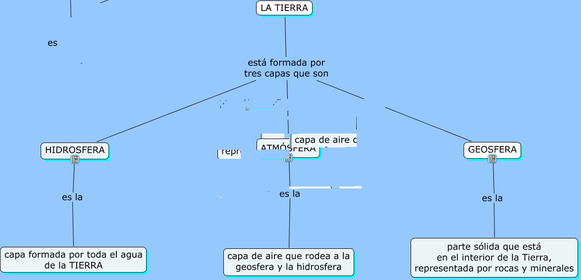 Este Cmap, tiene información relacionada con: LAS CAPAS DE LA TIERRA, ATMÓSFERA es la capa de aire que rodea a la geosfera y la hidrosfera, LA TIERRA está formada por tres capas que son GEOSFERA, LA TIERRA está formada por tres capas que son ATMÓSFERA, LA TIERRA está formada por tres capas que son HIDROSFERA, GEOSFERA es la parte sólida que está en el interior de la Tierra, representada por rocas y minerales, HIDROSFERA es la capa formada por toda el agua de la TIERRA