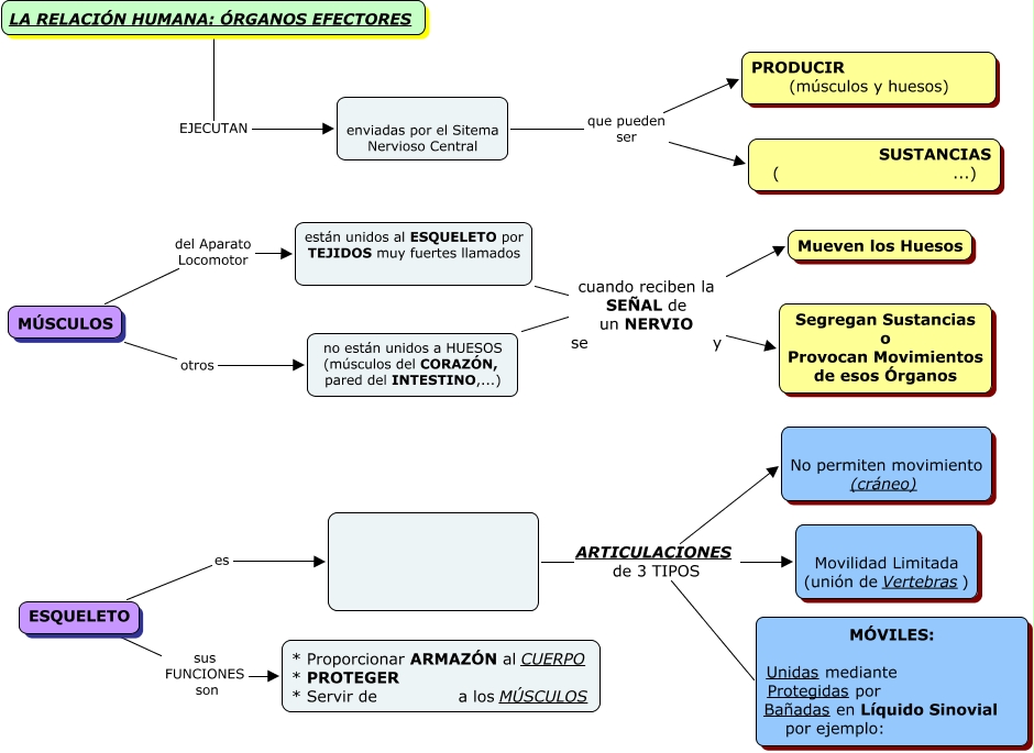 Este Cmap, tiene información relacionada con: LA RELACIÓN HUMANA - 3 - ÓRGANOS EFECTORES - MUDO, no están unidos a HUESOS (músculos del CORAZÓN, pared del INTESTINO,...) cuando reciben la SEÑAL de un NERVIO se y Mueven los Huesos, ARTICULACIONES de 3 TIPOS MÓVILES: Unidas mediante Protegidas por Bañadas en Líquido Sinovial por ejemplo:, están unidos al ESQUELETO por TEJIDOS muy fuertes llamados cuando reciben la SEÑAL de un NERVIO se y Mueven los Huesos, enviadas por el Sitema Nervioso Central que pueden ser PRODUCIR (músculos y huesos), ARTICULACIONES de 3 TIPOS No permiten movimiento (cráneo), MÚSCULOS otros no están unidos a HUESOS (músculos del CORAZÓN, pared del INTESTINO,...), ESQUELETO es, MÚSCULOS del Aparato Locomotor están unidos al ESQUELETO por TEJIDOS muy fuertes llamados, LA RELACIÓN HUMANA: ÓRGANOS EFECTORES EJECUTAN enviadas por el Sitema Nervioso Central, están unidos al ESQUELETO por TEJIDOS muy fuertes llamados cuando reciben la SEÑAL de un NERVIO se y Segregan Sustancias o Provocan Movimientos de esos Órganos, enviadas por el Sitema Nervioso Central que pueden ser SUSTANCIAS ( ...), ESQUELETO sus FUNCIONES son * Proporcionar ARMAZÓN al CUERPO * PROTEGER * Servir de a los MÚSCULOS, ARTICULACIONES de 3 TIPOS Movilidad Limitada (unión de Vertebras), no están unidos a HUESOS (músculos del CORAZÓN, pared del INTESTINO,...) cuando reciben la SEÑAL de un NERVIO se y Segregan Sustancias o Provocan Movimientos de esos Órganos