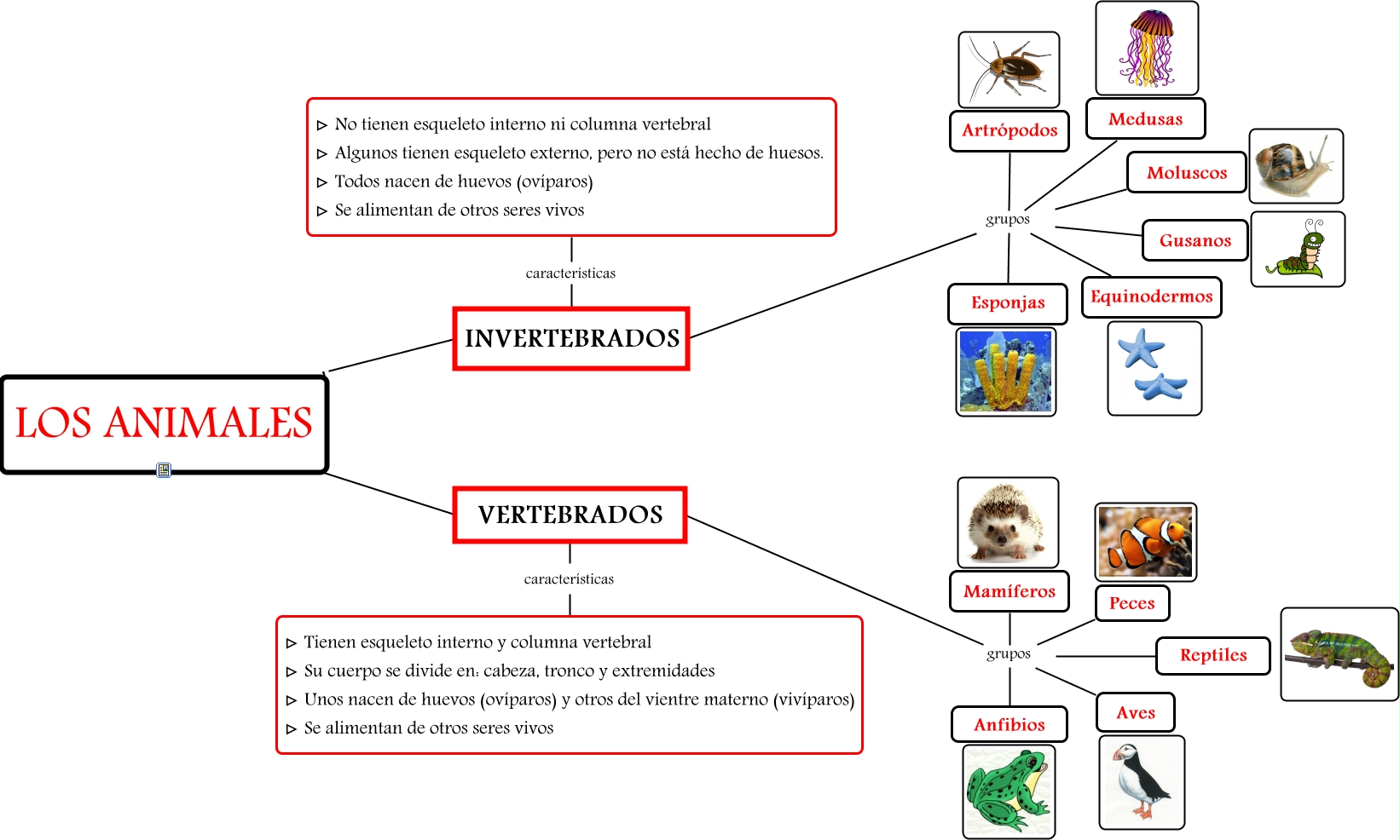 Este Cmap, tiene información relacionada con: VERTEBRADOS E INVERTEBRADOS 3º, INVERTEBRADOS grupos Artrópodos, VERTEBRADOS grupos Mamíferos, VERTEBRADOS grupos Aves, LOS ANIMALES . VERTEBRADOS, LOS ANIMALES . INVERTEBRADOS, INVERTEBRADOS características ⊳ No tienen esqueleto interno ni columna vertebral ⊳ Algunos tienen esqueleto externo, pero no está hecho de huesos. ⊳ Todos nacen de huevos (ovíparos) ⊳ Se alimentan de otros seres vivos, INVERTEBRADOS grupos Moluscos, VERTEBRADOS características ⊳ Tienen esqueleto interno y columna vertebral ⊳ Su cuerpo se divide en: cabeza, tronco y extremidades ⊳ Unos nacen de huevos (ovíparos) y otros del vientre materno (vivíparos) ⊳ Se alimentan de otros seres vivos, INVERTEBRADOS grupos Equinodermos, VERTEBRADOS grupos Anfibios, VERTEBRADOS grupos Peces, INVERTEBRADOS grupos Esponjas, INVERTEBRADOS grupos Gusanos, INVERTEBRADOS grupos Medusas, VERTEBRADOS grupos Reptiles