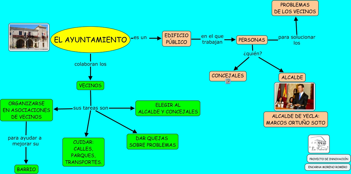 Este Cmap, tiene información relacionada con: AYUNTAMIENTO, VECINOS sus tareas son ORGANIZARSE EN ASOCIACIONES DE VECINOS, VECINOS sus tareas son ELEGIR AL ALCALDE Y CONCEJALES, PERSONAS para solucionar los PROBLEMAS DE LOS VECINOS, EL AYUNTAMIENTO es un EDIFICIO PÚBLICO, VECINOS sus tareas son CUIDAR: CALLES, PARQUES, TRANSPORTES., EDIFICIO PÚBLICO en el que trabajan PERSONAS, VECINOS sus tareas son DAR QUEJAS SOBRE PROBLEMAS, PERSONAS ¿quién? CONCEJALES, PERSONAS ¿quién? ALCALDE, ORGANIZARSE EN ASOCIACIONES DE VECINOS para ayudar a mejorar su BARRIO, EL AYUNTAMIENTO colaboran los VECINOS