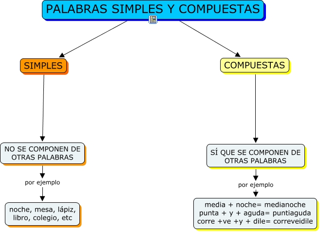 Este Cmap, tiene información relacionada con: TEMA 7 PALABRAS SIMPLES Y COMPUESTAS, NO SE COMPONEN DE OTRAS PALABRAS por ejemplo noche, mesa, lápiz, libro, colegio, etc, SIMPLES ???? NO SE COMPONEN DE OTRAS PALABRAS, PALABRAS SIMPLES Y COMPUESTAS ???? SIMPLES, S�? QUE SE COMPONEN DE OTRAS PALABRAS por ejemplo media + noche= medianoche punta + y + aguda= puntiaguda corre +ve +y + dile= correveidile, COMPUESTAS ???? S�? QUE SE COMPONEN DE OTRAS PALABRAS, PALABRAS SIMPLES Y COMPUESTAS ???? COMPUESTAS