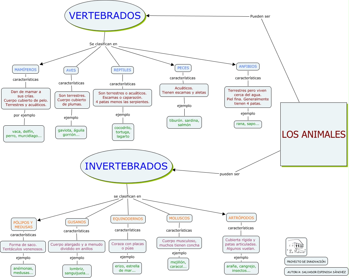 Este Cmap, tiene información relacionada con: Animales vertebrados e invertebrados-5º, ANFIBIOS características Terrestres pero viven cerca del agua. Piel fina. Generalmente tienen 4 patas., VERTEBRADOS Se clasifican en REPTILES, Forma de saco. Tentáculos venenosos. ejemplo anémonas, medusas..., Cuerpo musculoso, muchos tienen concha ejemplo mejillón, caracol..., Coraza con placas o púas ejemplo erizo, estrella de mar..., Son terrestres. Cuerpo cubierto de plumas. ejemplo gaviota, águila gorrión..., VERTEBRADOS Se clasifican en AVES, INVERTEBRADOS se clasifican en ARTRÓPODOS, VERTEBRADOS Se clasifican en MAM�?FEROS, PECES características Acuáticos. Tienen escamas y aletas, INVERTEBRADOS se clasifican en MOLUSCOS, Cuerpo alargado y a menudo dividido en anillos ejemplo lombriz, sanguijuela..., Son terrestres o acuáticos. Escamas o caparazón. 4 patas menos las serpientes. ejemplo cocodrilo, tortuga, lagarto, INVERTEBRADOS se clasifican en GUSANOS, ARTRÓPODOS características Cubierta rígida y patas articuladas. Algunos vuelan., GUSANOS características Cuerpo alargado y a menudo dividido en anillos, VERTEBRADOS Se clasifican en ANFIBIOS, Dan de mamar a sus crías. Cuerpo cubierto de pelo. Terrestres y acuáticos. por ejemplo vaca, delfín, perro, murciélago..., PÓLIPOS Y MEDUSAS características Forma de saco. Tentáculos venenosos., Acuáticos. Tienen escamas y aletas ejemplo tiburón. sardina, salmón