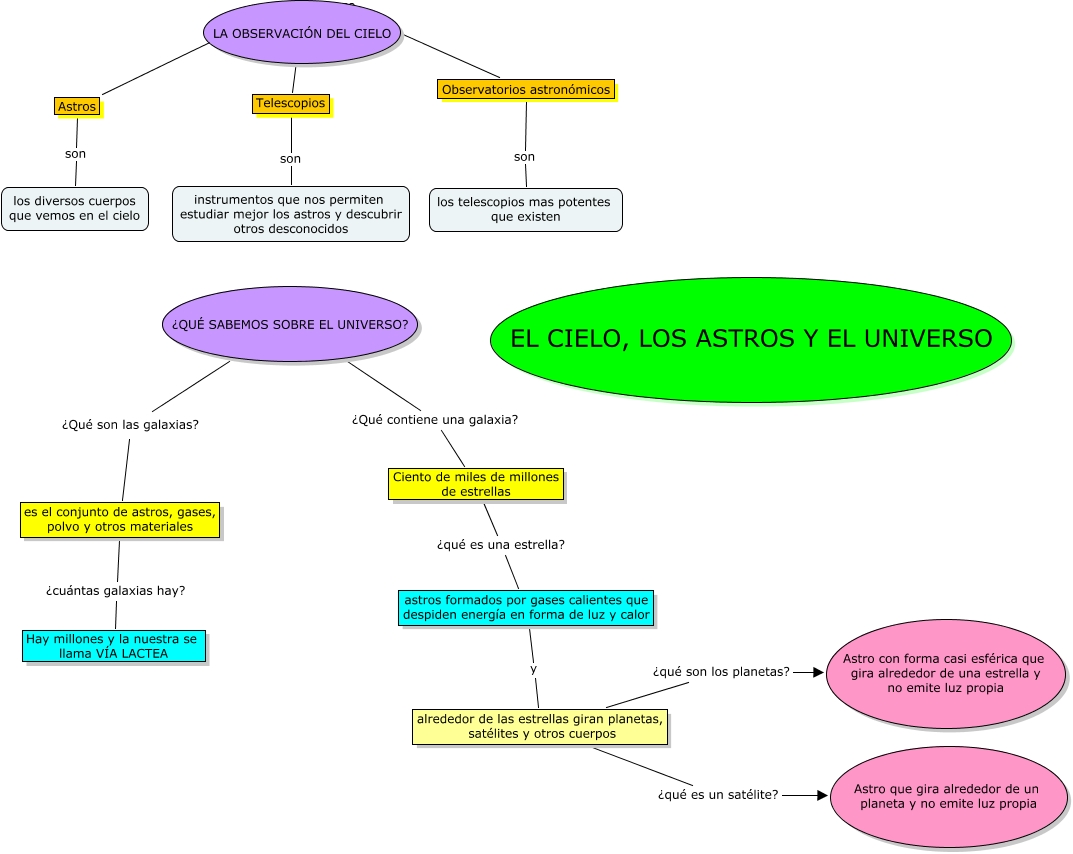 Este Cmap, tiene información relacionada con: EL CIELO, LOS ASTROS Y EL UNIVERSO, ¿QUÉ SABEMOS SOBRE EL UNIVERSO? ¿Qué son las galaxias? es el conjunto de astros, gases, polvo y otros materiales, Ciento de miles de millones de estrellas ¿qué es una estrella? astros formados por gases calientes que despiden energía en forma de luz y calor, LA OBSERVACIÓN DEL CIELO ???? Astros, alrededor de las estrellas giran planetas, satélites y otros cuerpos ¿qué es un satélite? Astro que gira alrededor de un planeta y no emite luz propia, astros formados por gases calientes que despiden energía en forma de luz y calor y alrededor de las estrellas giran planetas, satélites y otros cuerpos, LA OBSERVACIÓN DEL CIELO ???? Observatorios astronómicos, Telescopios son instrumentos que nos permiten estudiar mejor los astros y descubrir otros desconocidos, Observatorios astronómicos son los telescopios mas potentes que existen, Astros son los diversos cuerpos que vemos en el cielo, ¿QUÉ SABEMOS SOBRE EL UNIVERSO? ¿Qué contiene una galaxia? Ciento de miles de millones de estrellas, LA OBSERVACIÓN DEL CIELO ???? Telescopios, es el conjunto de astros, gases, polvo y otros materiales ¿cuántas galaxias hay? Hay millones y la nuestra se llama V�?A LACTEA, alrededor de las estrellas giran planetas, satélites y otros cuerpos ¿qué son los planetas? Astro con forma casi esférica que gira alrededor de una estrella y no emite luz propia