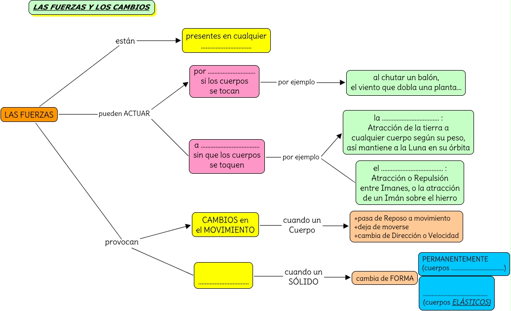 Este Cmap, tiene información relacionada con: 3 - LAS FUERZAS Y LOS CAMBIOS MUDO, ............................... cuando un SÓLIDO cambia de FORMA, CAMBIOS en el MOVIMIENTO cuando un Cuerpo +pasa de Reposo a movimiento +deja de moverse +cambia de Dirección o Velocidad, LAS FUERZAS provocan CAMBIOS en el MOVIMIENTO, LAS FUERZAS están presentes en cualquier ..............................., LAS FUERZAS pueden ACTUAR a .................................... sin que los cuerpos se toquen, por ............................. si los cuerpos se tocan por ejemplo al chutar un balón, el viento que dobla una planta..., a .................................... sin que los cuerpos se toquen por ejemplo el ...................................... : Atracción o Repulsión entre Imanes, o la atracción de un Imán sobre el hierro, LAS FUERZAS provocan ..............................., LAS FUERZAS pueden ACTUAR por ............................. si los cuerpos se tocan, a .................................... sin que los cuerpos se toquen por ejemplo la ................................... : Atracción de la tierra a cualquier cuerpo según su peso, así mantiene a la Luna en su órbita