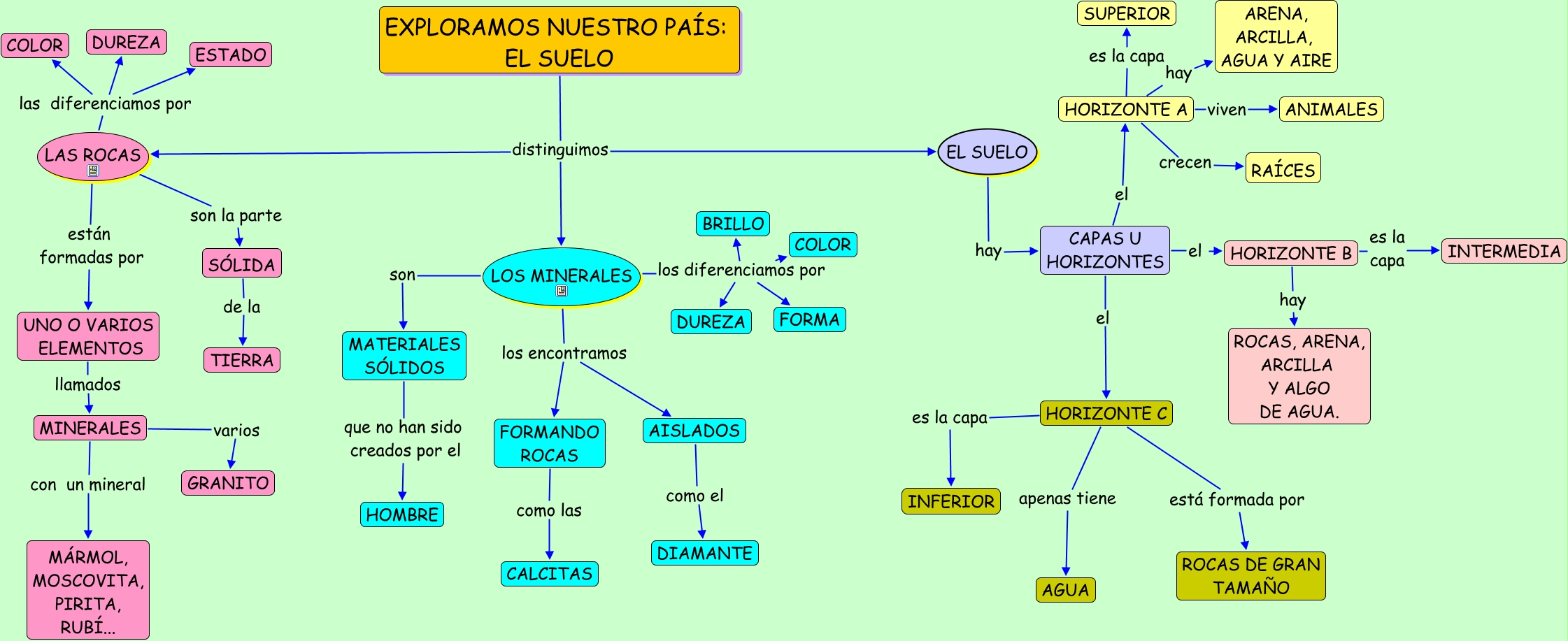 Este Cmap, tiene información relacionada con: EXPLORAMOS NUESTRO PA�?S1 4º, HORIZONTE B es la capa INTERMEDIA, HORIZONTE A hay ARENA, ARCILLA, AGUA Y AIRE, CAPAS U HORIZONTES el HORIZONTE C, MINERALES varios GRANITO, EXPLORAMOS NUESTRO PA�?S: EL SUELO distinguimos LOS MINERALES, HORIZONTE C es la capa INFERIOR, LAS ROCAS las diferenciamos por ESTADO, LAS ROCAS las diferenciamos por DUREZA, HORIZONTE A es la capa SUPERIOR, LOS MINERALES son MATERIALES SÓLIDOS, SÓLIDA de la TIERRA, AISLADOS como el DIAMANTE, HORIZONTE A crecen RA�?CES, HORIZONTE B hay ROCAS, ARENA, ARCILLA Y ALGO DE AGUA., LOS MINERALES los diferenciamos por BRILLO, HORIZONTE C apenas tiene AGUA, EXPLORAMOS NUESTRO PA�?S: EL SUELO distinguimos EL SUELO, LAS ROCAS están formadas por UNO O VARIOS ELEMENTOS, LAS ROCAS las diferenciamos por COLOR, EL SUELO hay CAPAS U HORIZONTES