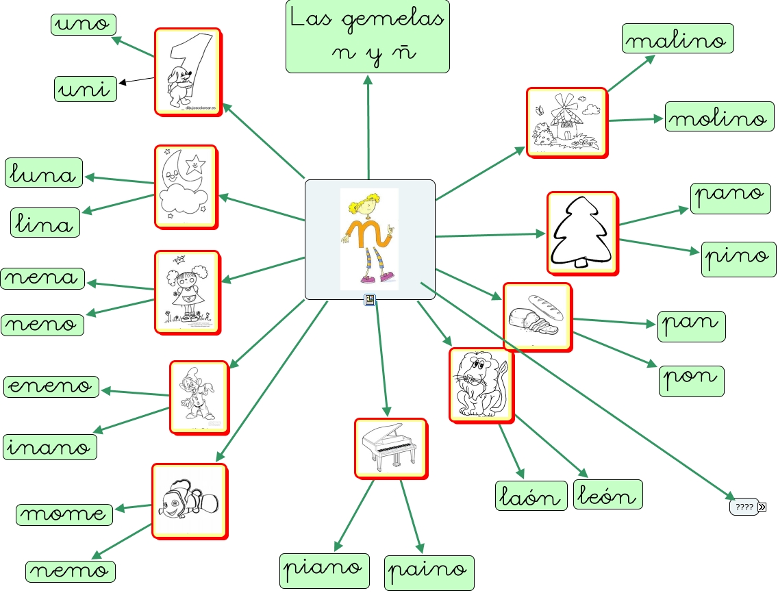 Este Cmap, tiene información relacionada con: n y ñ, nena, uni, pon, uno, sílabas o no, paino, sílabas u nu, ???? Las gemelas n y ñ, lina, sílabas i ni, pan, pino, pano, nemo, piano, malino, sílabas e ne, eneno, ???? sílabas, mome