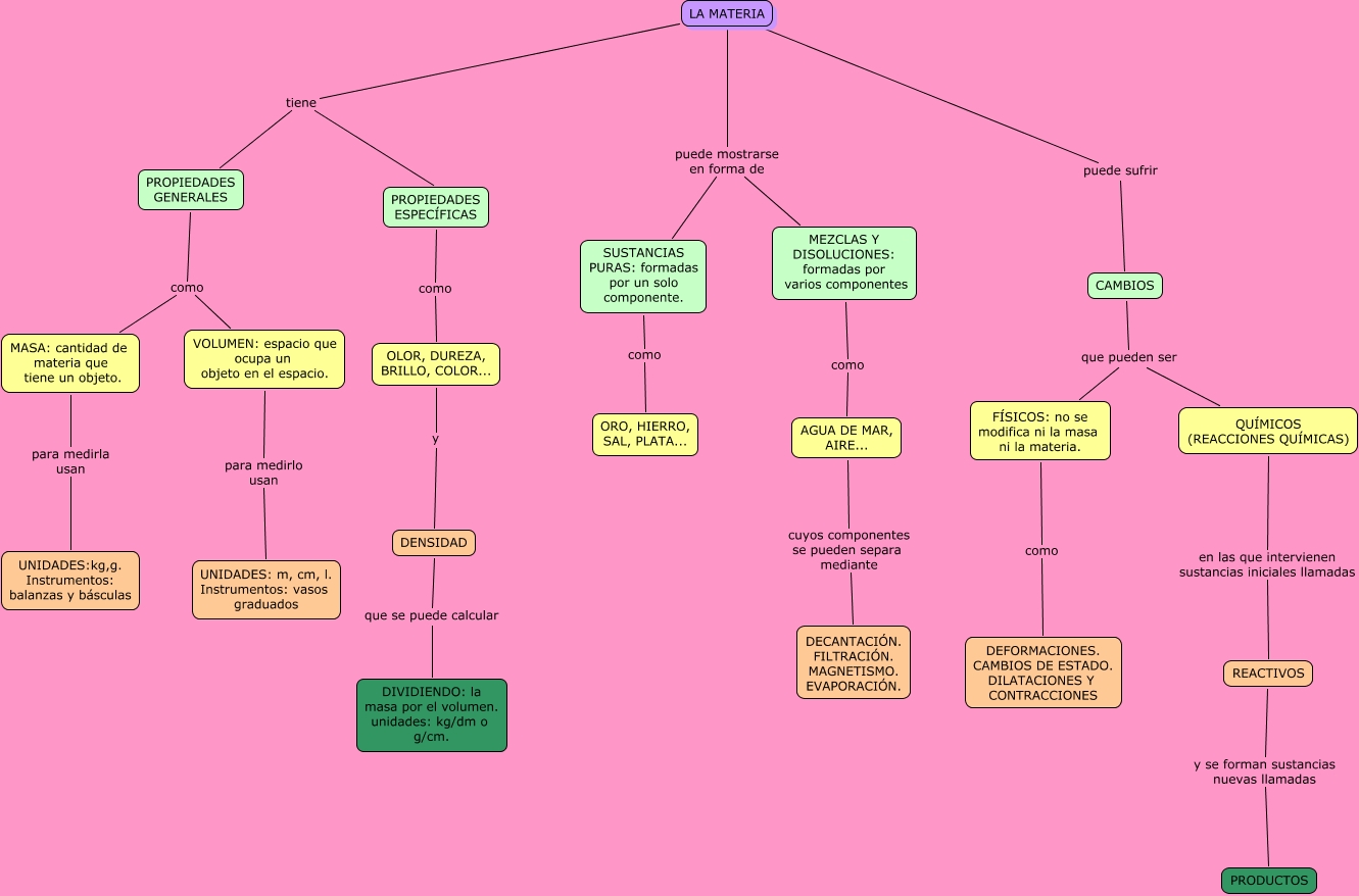 Este Cmap, tiene información relacionada con: LA MATERIA, MASA: cantidad de materia que tiene un objeto. para medirla usan UNIDADES:kg,g. Instrumentos: balanzas y básculas, CAMBIOS que pueden ser QU�?MICOS (REACCIONES QU�?MICAS), F�?SICOS: no se modifica ni la masa ni la materia. como DEFORMACIONES. CAMBIOS DE ESTADO. DILATACIONES Y CONTRACCIONES, SUSTANCIAS PURAS: formadas por un solo componente. como ORO, HIERRO, SAL, PLATA..., LA MATERIA puede mostrarse en forma de SUSTANCIAS PURAS: formadas por un solo componente., DENSIDAD que se puede calcular DIVIDIENDO: la masa por el volumen. unidades: kg/dm o g/cm., PROPIEDADES ESPEC�?FICAS como OLOR, DUREZA, BRILLO, COLOR..., QU�?MICOS (REACCIONES QU�?MICAS) en las que intervienen sustancias iniciales llamadas REACTIVOS, CAMBIOS que pueden ser F�?SICOS: no se modifica ni la masa ni la materia., LA MATERIA tiene PROPIEDADES ESPEC�?FICAS, LA MATERIA puede sufrir CAMBIOS, AGUA DE MAR, AIRE... cuyos componentes se pueden separa mediante DECANTACIÓN. FILTRACIÓN. MAGNETISMO. EVAPORACIÓN., OLOR, DUREZA, BRILLO, COLOR... y DENSIDAD, PROPIEDADES GENERALES como VOLUMEN: espacio que ocupa un objeto en el espacio., REACTIVOS y se forman sustancias nuevas llamadas PRODUCTOS, MEZCLAS Y DISOLUCIONES: formadas por varios componentes como AGUA DE MAR, AIRE..., LA MATERIA puede mostrarse en forma de MEZCLAS Y DISOLUCIONES: formadas por varios componentes, VOLUMEN: espacio que ocupa un objeto en el espacio. para medirlo usan UNIDADES: m, cm, l. Instrumentos: vasos graduados, LA MATERIA tiene PROPIEDADES GENERALES, PROPIEDADES GENERALES como MASA: cantidad de materia que tiene un objeto.