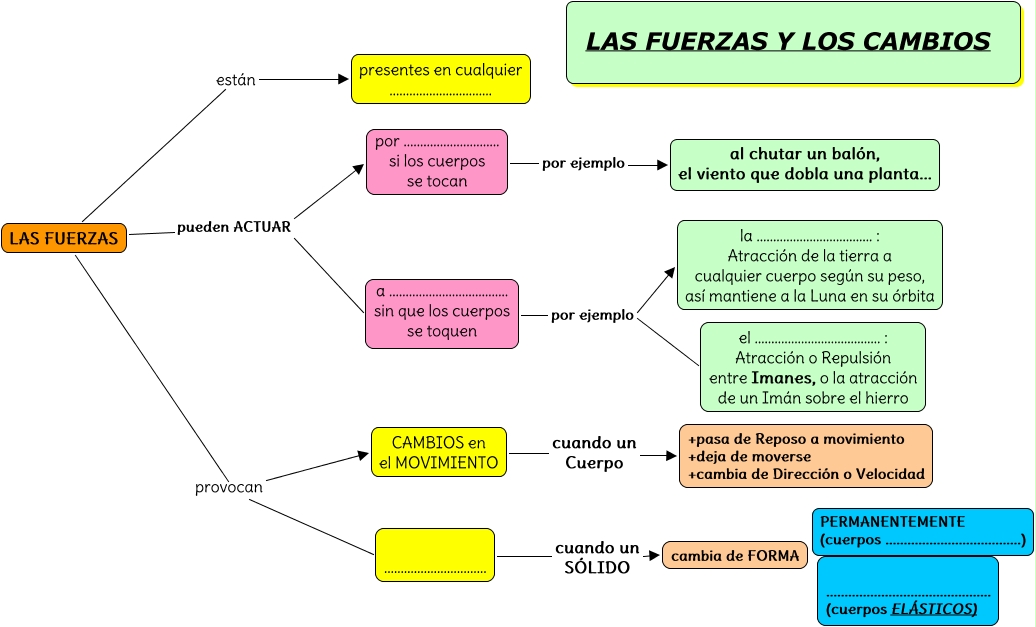Este Cmap, tiene información relacionada con: 3 - LAS FUERZAS Y LOS CAMBIOS MUDO, ............................... cuando un SÓLIDO cambia de FORMA, CAMBIOS en el MOVIMIENTO cuando un Cuerpo +pasa de Reposo a movimiento +deja de moverse +cambia de Dirección o Velocidad, LAS FUERZAS provocan CAMBIOS en el MOVIMIENTO, LAS FUERZAS están presentes en cualquier ..............................., LAS FUERZAS pueden ACTUAR a .................................... sin que los cuerpos se toquen, por ............................. si los cuerpos se tocan por ejemplo al chutar un balón, el viento que dobla una planta..., a .................................... sin que los cuerpos se toquen por ejemplo el ...................................... : Atracción o Repulsión entre Imanes, o la atracción de un Imán sobre el hierro, LAS FUERZAS provocan ..............................., LAS FUERZAS pueden ACTUAR por ............................. si los cuerpos se tocan, a .................................... sin que los cuerpos se toquen por ejemplo la ................................... : Atracción de la tierra a cualquier cuerpo según su peso, así mantiene a la Luna en su órbita