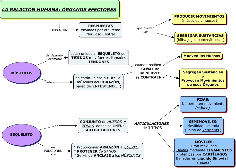 Este Cmap, tiene información relacionada con: LA RELACIÓN HUMANA - 3 - ÓRGANOS EFECTORES, no están unidos a HUESOS (músculos del CORAZÓN, pared del INTESTINO,...) cuando reciben la SEÑAL de un NERVIO se CONTRAEN y Mueven los Huesos, CONJUNTO de HUESOS y ZONAS donde se UNEN: ARTICULACIONES ARTICULACIONES de 3 TIPOS MÓVILES: Gran movilidad. Unidas mediante LIGAMENTOS Protegidas por CART�?LAGOS Bañadas en Líquido Sinovial (rodilla), están unidos al ESQUELETO por TEJIDOS muy fuertes llamados TENDONES cuando reciben la SEÑAL de un NERVIO se CONTRAEN y Mueven los Huesos, RESPUESTAS enviadas por el Sitema Nervioso Central que pueden ser PRODUCIR MOVIMIENTOS (músculos y huesos), CONJUNTO de HUESOS y ZONAS donde se UNEN: ARTICULACIONES ARTICULACIONES de 3 TIPOS FIJAS: No permiten movimiento (cráneo), MÚSCULOS otros no están unidos a HUESOS (músculos del CORAZÓN, pared del INTESTINO,...), ESQUELETO es CONJUNTO de HUESOS y ZONAS donde se UNEN: ARTICULACIONES, MÚSCULOS del Aparato Locomotor están unidos al ESQUELETO por TEJIDOS muy fuertes llamados TENDONES, LA RELACIÓN HUMANA: ÓRGANOS EFECTORES EJECUTAN RESPUESTAS enviadas por el Sitema Nervioso Central, están unidos al ESQUELETO por TEJIDOS muy fuertes llamados TENDONES cuando reciben la SEÑAL de un NERVIO se CONTRAEN y Segregan Sustancias o Provocan Movimientos de esos Órganos, RESPUESTAS enviadas por el Sitema Nervioso Central que pueden ser SEGREGAR SUSTANCIAS (bilis, jugos pancreáticos...), ESQUELETO sus FUNCIONES son * Proporcionar ARMAZÓN al CUERPO * PROTEGER ÓRGANOS * Servir de ANCLAJE a los MÚSCULOS, CONJUNTO de HUESOS y ZONAS donde se UNEN: ARTICULACIONES ARTICULACIONES de 3 TIPOS SEMIMÓVILES: Movilidad Limitada (unión de Vertebras), no están unidos a HUESOS (músculos del CORAZÓN, pared del INTESTINO,...) cuando reciben la SEÑAL de un NERVIO se CONTRAEN y Segregan Sustancias o Provocan Movimientos de esos Órganos