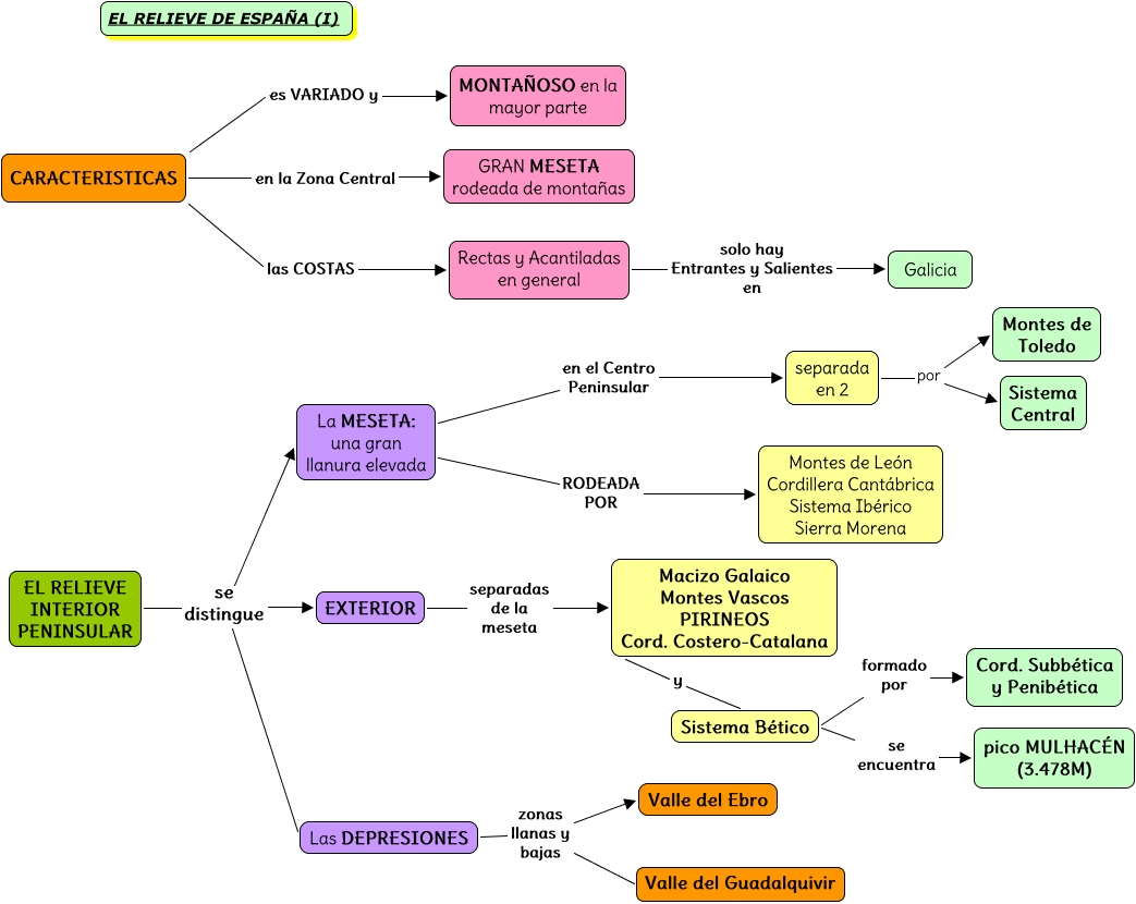 Este Cmap, tiene información relacionada con: 9.2 - EL RELIEVE DE ESPAÑA 1, Sistema Bético se encuentra pico MULHACÉN (3.478M), EXTERIOR separadas de la meseta Macizo Galaico Montes Vascos PIRINEOS Cord. Costero-Catalana, separada en 2 por Montes de Toledo, La MESETA: una gran llanura elevada en el Centro Peninsular separada en 2, Las DEPRESIONES zonas llanas y bajas Valle del Ebro, separada en 2 por Sistema Central, EL RELIEVE INTERIOR PENINSULAR se distingue Las DEPRESIONES, Las DEPRESIONES zonas llanas y bajas Valle del Guadalquivir, CARACTERISTICAS las COSTAS Rectas y Acantiladas en general, CARACTERISTICAS es VARIADO y MONTAÑOSO en la mayor parte, EL RELIEVE INTERIOR PENINSULAR se distingue La MESETA: una gran llanura elevada, La MESETA: una gran llanura elevada RODEADA POR Montes de León Cordillera Cantábrica Sistema Ibérico Sierra Morena, CARACTERISTICAS en la Zona Central GRAN MESETA rodeada de montañas, Sistema Bético formado por Cord. Subbética y Penibética, Macizo Galaico Montes Vascos PIRINEOS Cord. Costero-Catalana y Sistema Bético, EL RELIEVE INTERIOR PENINSULAR se distingue EXTERIOR, Rectas y Acantiladas en general solo hay Entrantes y Salientes en Galicia