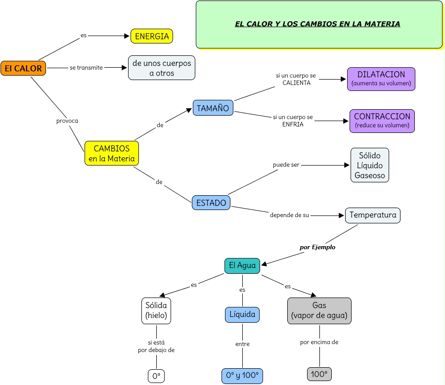 Este Cmap, tiene información relacionada con: 2 - EL CALOR Y LOS CAMBIOS, El CALOR es ENERGIA, El CALOR provoca CAMBIOS en la Materia, El Agua es Líquida, TAMAÑO si un cuerpo se CALIENTA DILATACION (aumenta su volumen), TAMAÑO si un cuerpo se ENFRIA CONTRACCION (reduce su volumen), CAMBIOS en la Materia de ESTADO, ESTADO depende de su Temperatura, CAMBIOS en la Materia de TAMAÑO, El Agua es Gas (vapor de agua), Sólida (hielo) si está por debajo de 0º, Temperatura por Ejemplo El Agua, Gas (vapor de agua) por encima de 100º, El CALOR se transmite de unos cuerpos a otros, ESTADO puede ser Sólido Líquido Gaseoso, El Agua es Sólida (hielo), Líquida entre 0º y 100º