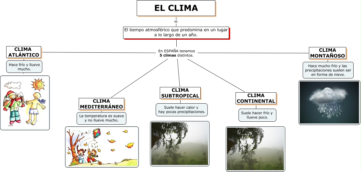 Este Cmap, tiene información relacionada con: EL CLIMA, EL CLIMA es El tiempo atmosférico que predomina en un lugar a lo largo de un año., El tiempo atmosférico que predomina en un lugar a lo largo de un año. En ESPAÑA tenemos 5 climas distintos. CLIMA ATL�?NTICO, El tiempo atmosférico que predomina en un lugar a lo largo de un año. En ESPAÑA tenemos 5 climas distintos. CLIMA MEDITERR�?NEO, CLIMA CONTINENTAL ???? Suele hacer frío y llueve poco., El tiempo atmosférico que predomina en un lugar a lo largo de un año. En ESPAÑA tenemos 5 climas distintos. CLIMA CONTINENTAL, CLIMA MONTAÑOSO ???? Hace mucho frío y las precipitaciones suelen ser en forma de nieve., El tiempo atmosférico que predomina en un lugar a lo largo de un año. En ESPAÑA tenemos 5 climas distintos. CLIMA MONTAÑOSO, CLIMA ATL�?NTICO Hace frío y llueve mucho., CLIMA MEDITERR�?NEO ???? La temperatura es suave y no llueve mucho., El tiempo atmosférico que predomina en un lugar a lo largo de un año. En ESPAÑA tenemos 5 climas distintos. CLIMA SUBTROPICAL, CLIMA SUBTROPICAL ???? Suele hacer calor y hay pocas precipitaciones.