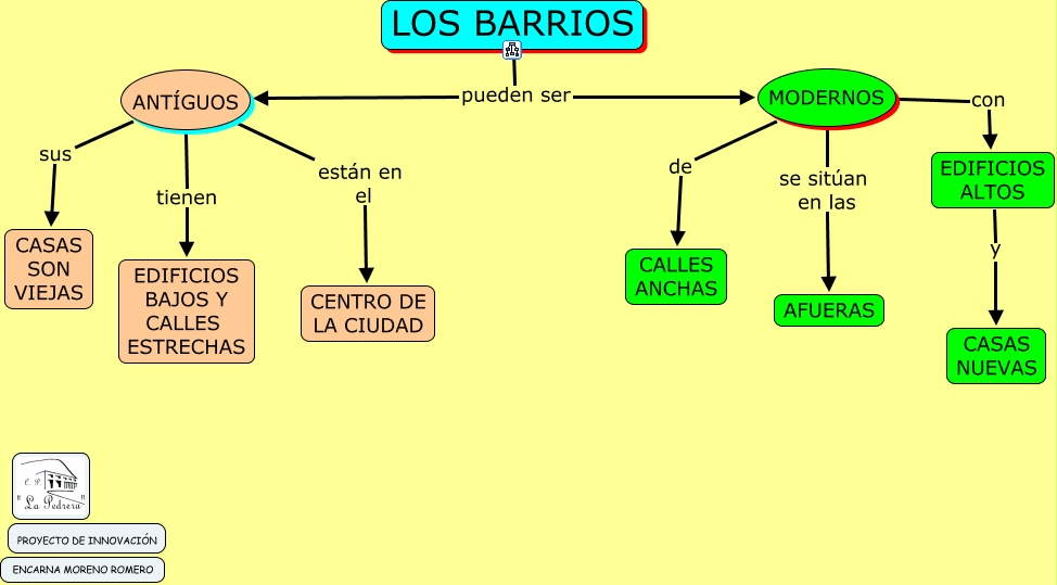 Este Cmap, tiene información relacionada con: BARRIOS 2º, EDIFICIOS ALTOS y CASAS NUEVAS, LOS BARRIOS pueden ser ANT�?GUOS, ANT�?GUOS están en el CENTRO DE LA CIUDAD, MODERNOS con EDIFICIOS ALTOS, MODERNOS se sitúan en las AFUERAS, MODERNOS de CALLES ANCHAS, LOS BARRIOS pueden ser MODERNOS, ANT�?GUOS tienen EDIFICIOS BAJOS Y CALLES ESTRECHAS, ANT�?GUOS sus CASAS SON VIEJAS