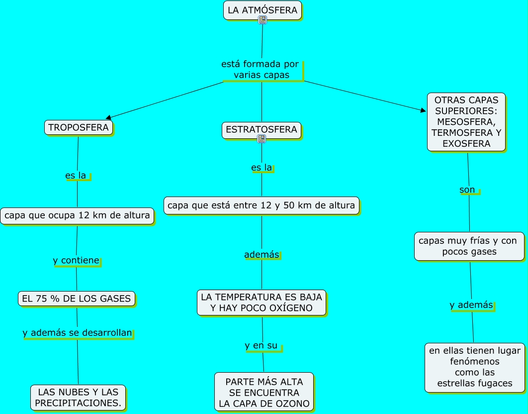 Este Cmap, tiene información relacionada con: LA ATMOSFERA Y SUS CAPAS, capa que está entre 12 y 50 km de altura además LA TEMPERATURA ES BAJA Y HAY POCO OX�?GENO, LA TEMPERATURA ES BAJA Y HAY POCO OX�?GENO y en su PARTE M�?S ALTA SE ENCUENTRA LA CAPA DE OZONO, ESTRATOSFERA es la capa que está entre 12 y 50 km de altura, EL 75 % DE LOS GASES y además se desarrollan LAS NUBES Y LAS PRECIPITACIONES., LA ATMÓSFERA está formada por varias capas TROPOSFERA, LA ATMÓSFERA está formada por varias capas OTRAS CAPAS SUPERIORES: MESOSFERA, TERMOSFERA Y EXOSFERA, LA ATMÓSFERA está formada por varias capas ESTRATOSFERA, TROPOSFERA es la capa que ocupa 12 km de altura, OTRAS CAPAS SUPERIORES: MESOSFERA, TERMOSFERA Y EXOSFERA son capas muy frías y con pocos gases, capa que ocupa 12 km de altura y contiene EL 75 % DE LOS GASES, capas muy frías y con pocos gases y además en ellas tienen lugar fenómenos como las estrellas fugaces