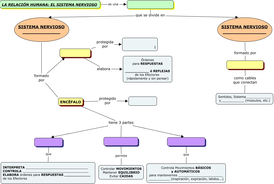 Este Cmap, tiene información relacionada con: LA RELACIÓN HUMANA - EL SISTEMA NERVIOSO - MUDO, SISTEMA NERVIOSO _____________ formado por, SISTEMA NERVIOSO _____________ formado por ENCÉFALO, permite Controlar MOVIMIENTOS Mantener EQUILIBRIO Evitar CAIDAS, elabora Órdenes para RESPUESTAS ___________ ó REFLEJAS de los Efectores (rápidamente y sin pensar), que Controla Movimientos B�?SICOS y AUTOM�?TICOS para mantenernos _______________________ ___________ (inspiración, expiración, latidos...), LA RELACIÓN HUMANA: EL SISTEMA NERVIOSO es una, que se divide en SISTEMA NERVIOSO _____________, ENCÉFALO tiene 3 partes, ENCÉFALO tiene 3 partes, ENCÉFALO tiene 3 partes, ENCÉFALO protegido por, que se divide en SISTEMA NERVIOSO _______________, que INTERPRETA ________________________________ CONTROLA __________________________________ ELABORA órdenes para RESPUESTAS ____________ de los Efectores, SISTEMA NERVIOSO _______________ formado por, como cables que conectan Sentidos, Sistema_____________ y____________ (músculos, etc.), protegida por l