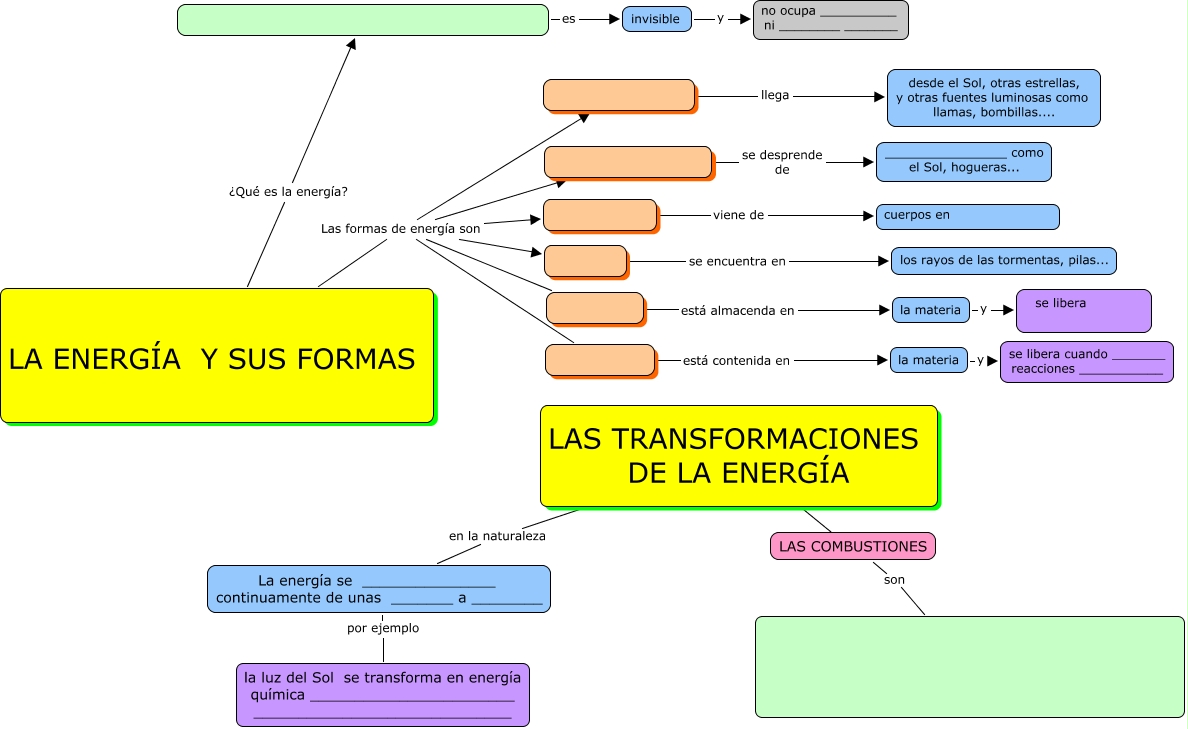 Este Cmap, tiene información relacionada con: LA ENERGIA- SUS FORMAS Y TRANSFORMACIONES-MUDO, llega desde el Sol, otras estrellas, y otras fuentes luminosas como llamas, bombillas...., se desprende de ________________ como el Sol, hogueras..., LA ENERG�?A Y SUS FORMAS Las formas de energía son, LA ENERG�?A Y SUS FORMAS Las formas de energía son, está almacenda en la materia, es invisible, LAS TRANSFORMACIONES DE LA ENERG�?A ???? LAS COMBUSTIONES, La energía se _______________ continuamente de unas _______ a ________ por ejemplo la luz del Sol se transforma en energía química _______________________ _____________________________, LA ENERG�?A Y SUS FORMAS Las formas de energía son, LAS TRANSFORMACIONES DE LA ENERG�?A en la naturaleza La energía se _______________ continuamente de unas _______ a ________, LA ENERG�?A Y SUS FORMAS Las formas de energía son, LA ENERG�?A Y SUS FORMAS Las formas de energía son, LA ENERG�?A Y SUS FORMAS ¿Qué es la energía?, la materia y se libera cuando _______ reacciones ___________, LAS COMBUSTIONES son, está contenida en la materia, se encuentra en los rayos de las tormentas, pilas..., la materia y se libera, viene de cuerpos en, invisible y no ocupa __________ ni ________ _______